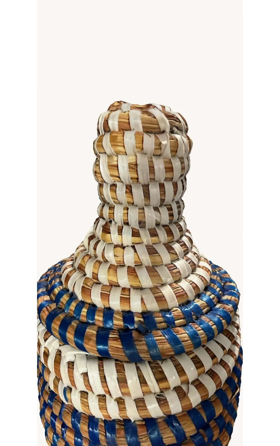 The materials used are predominantly blue and white, interwoven to create a striking contrast and pattern.Shape and Structure: