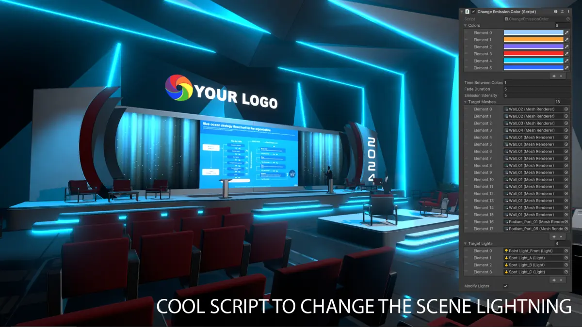 The grid system allows you to insert or remove elements to adjust them to your needs. The colors can also be changed! Is your client's logo red?No problem! You can change the colors of the lighting and materials. URP Package Inside.