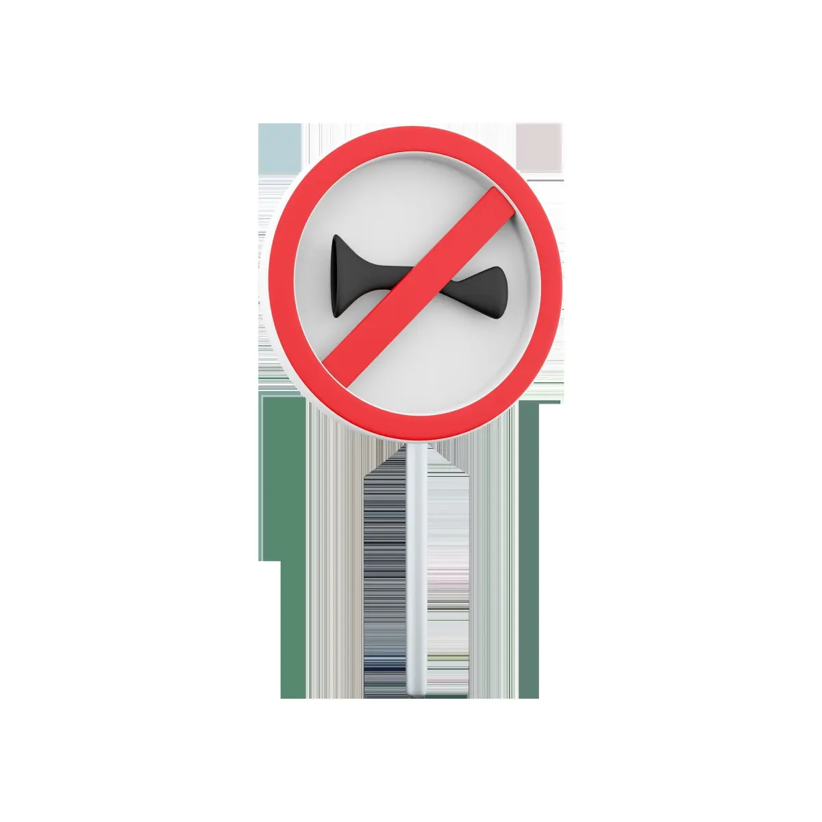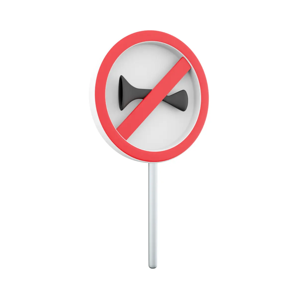 3d render no horn road sign isolated on white background. Crossed signal horn icon, prohibition of harsh sounds. Prohibit ringing. 3d rendering signal horn cartoon icon