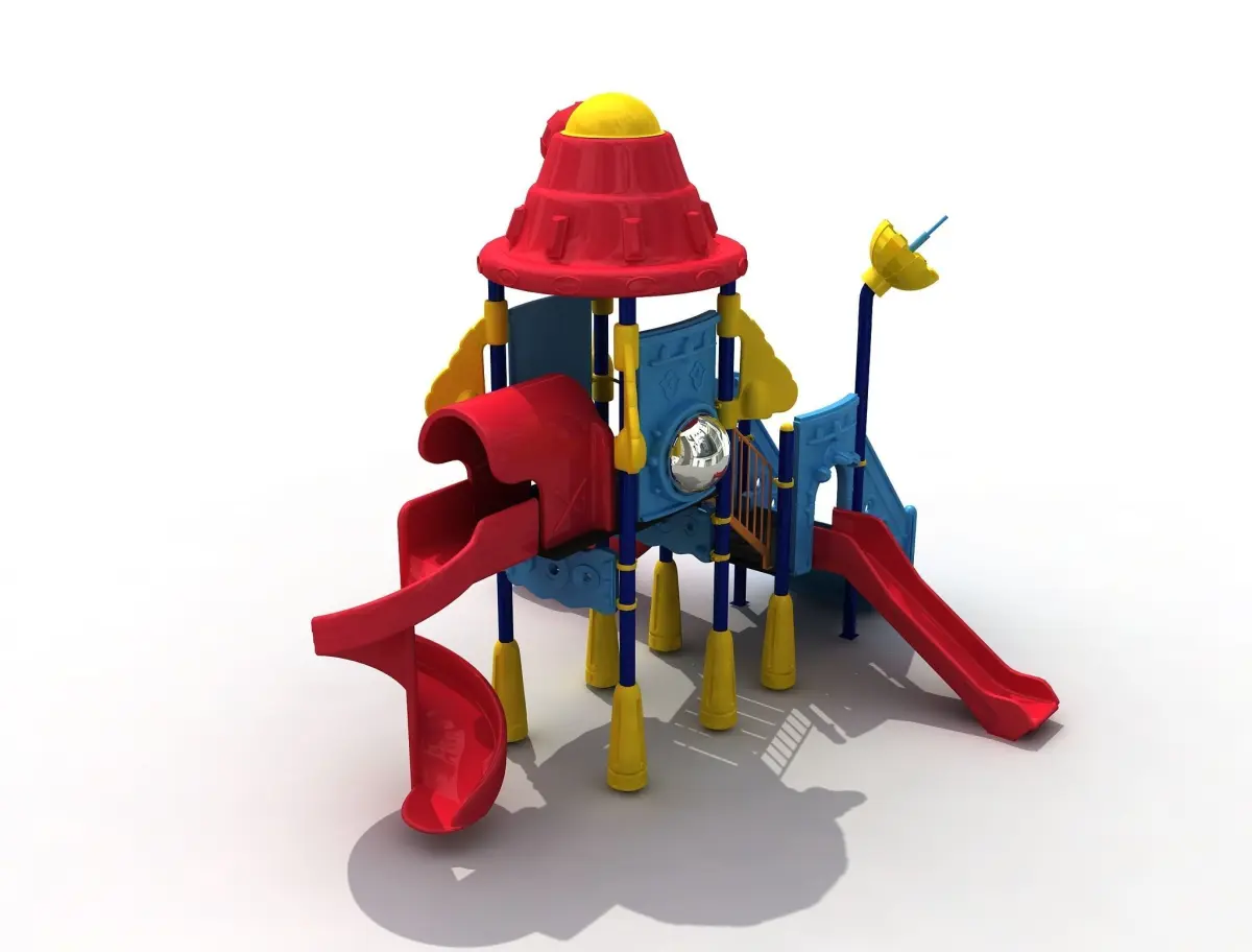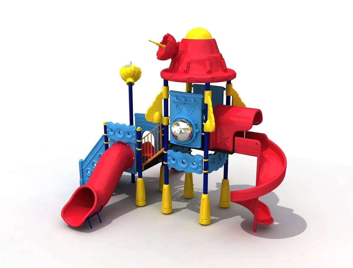 This is a metal 3d playground space concept. include in flat Slide , tube slide and spiral slide. spaceship roof and stairs, polythene barrier, special polythene parts, spaceship park concept,