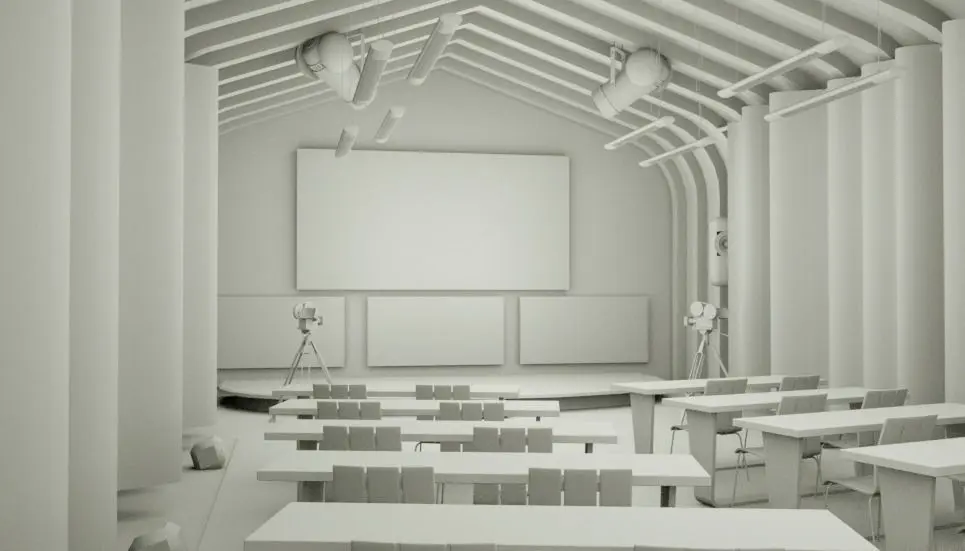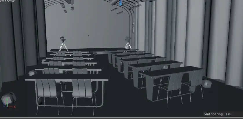 **3D Stage conference and events and theatre**Include:Speaker stage and two side camera.Side Curtains with down fade lights.Roof lamps.Stage screen and wall screen with light coloured texture.attandence tables and chairs.Speaker audio device on both sides.