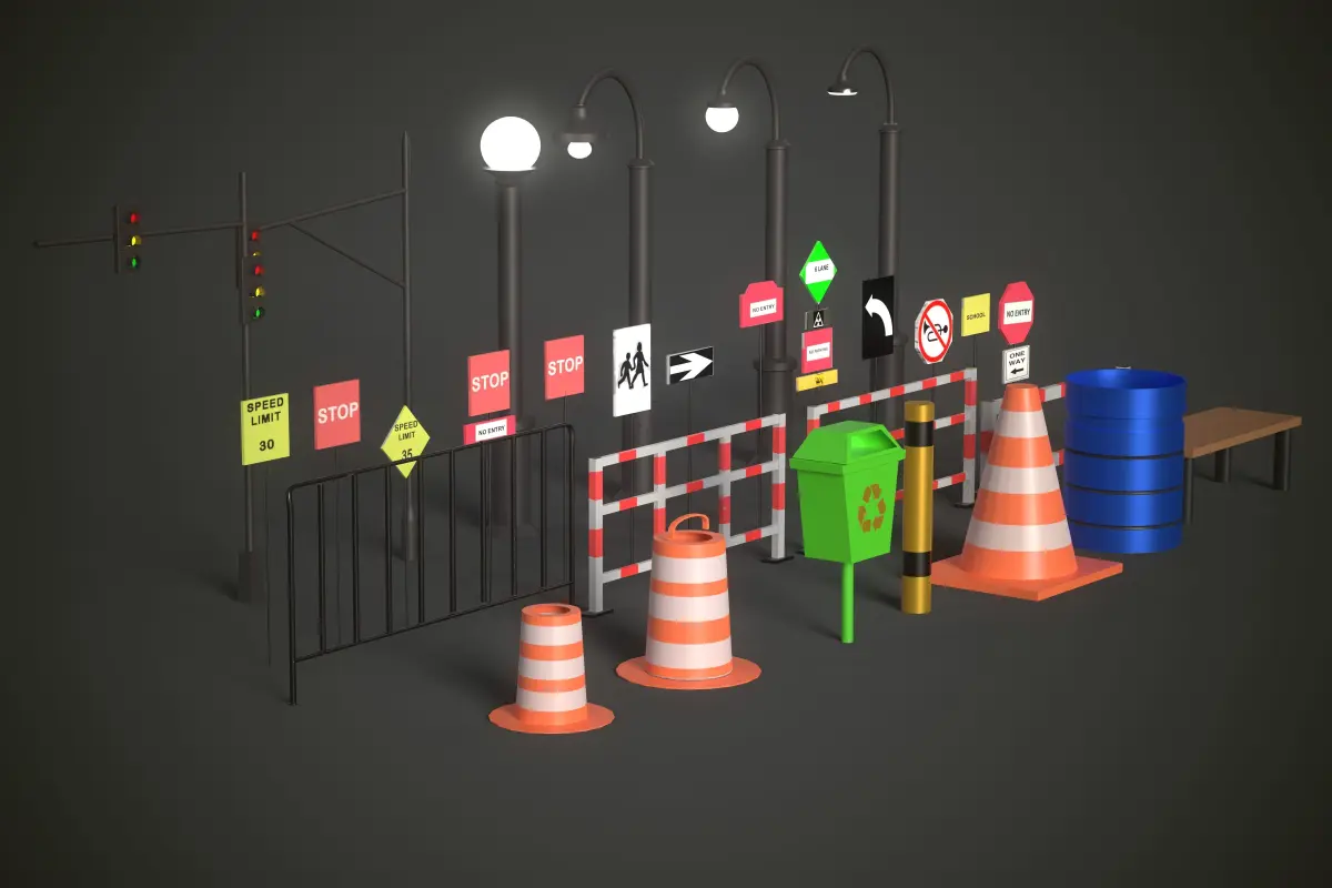 Street Props Textures And Materials : one PBR textures set in png format Each Model Textures Contain : Albedo 4K - Metalic 4k - Roughness 4K - Normal Map 4K - Emissive map 4K and game ready assets.