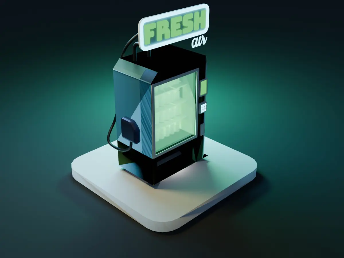 This is a 3D stylized vending machine with a sleek and modern design, topped with glowing 'FRESH air' signage. The model features a semi-realistic look with a glass display case, showcasing internal compartments for products. It's perfect for use in game environments, animations, or futuristic cityscapes. The clean base platform and vibrant lighting give it a polished and professional appearance, ready to integrate into various 3D projects.