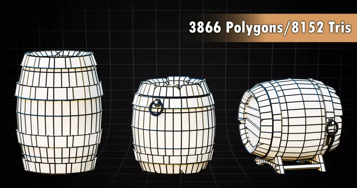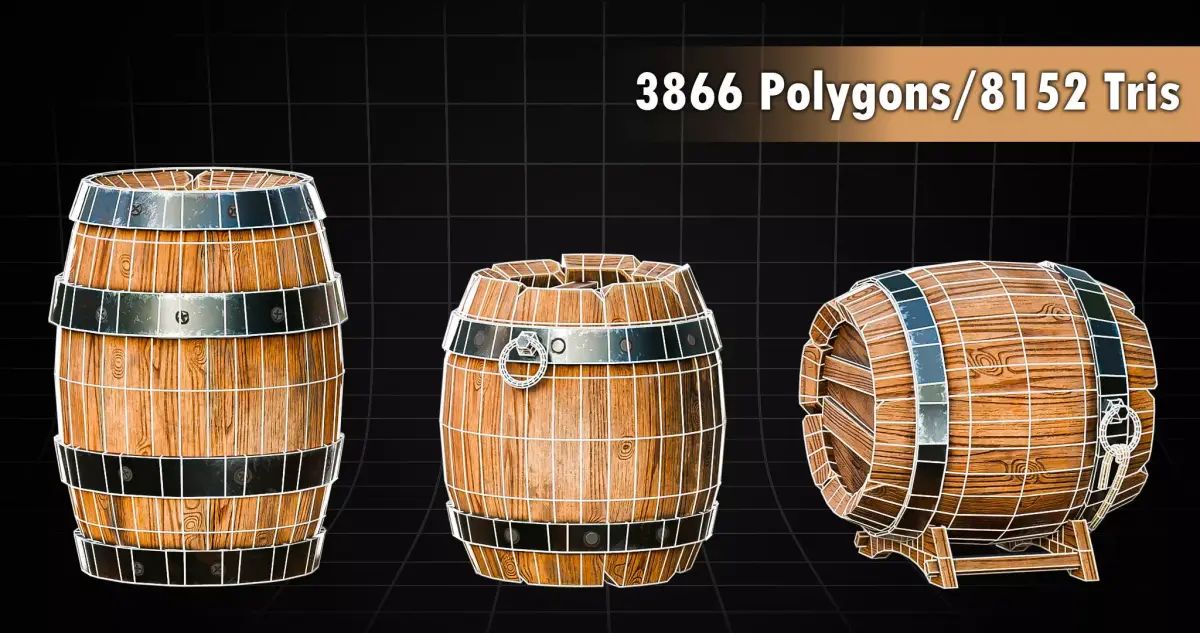 These stylized barrels are perfect for fantasy, medieval, rustic, tavern, warehouse, and environment scenes, and can be used as props for games, cinematics, and scene building.
