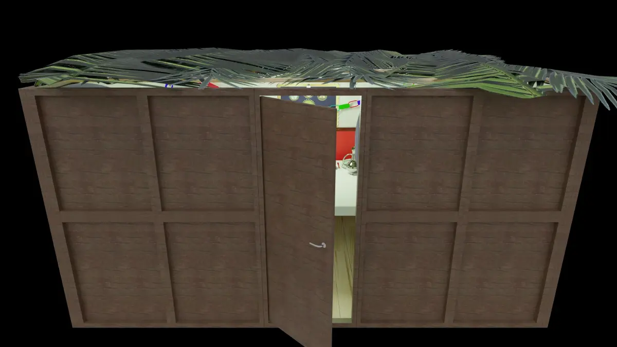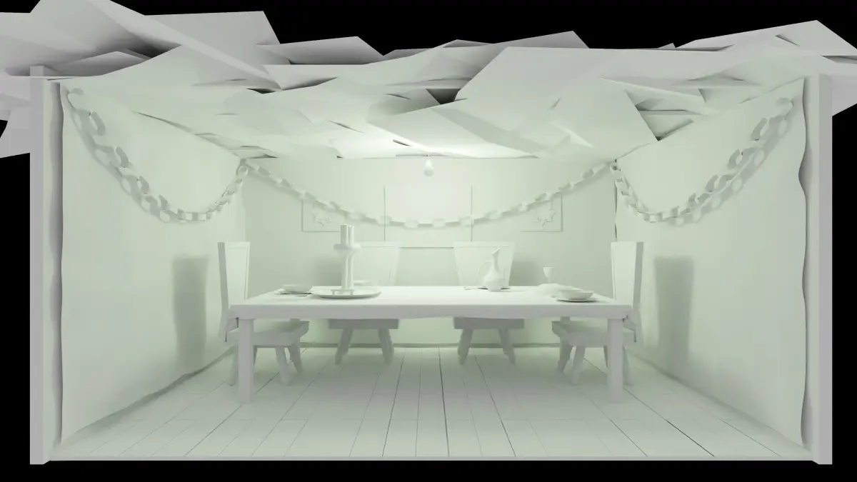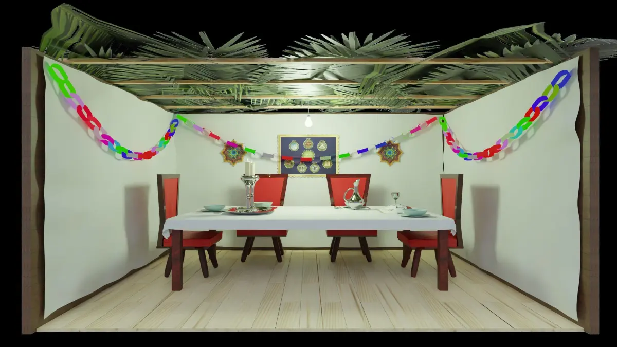 A detailed 3D Succah with a set table ready for the Yomtov meal.