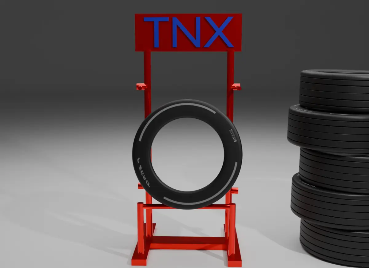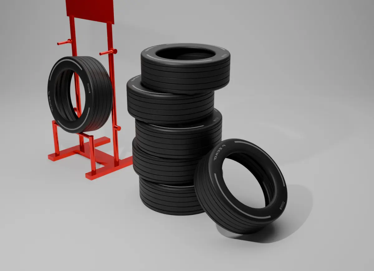 This high-quality 3D model pack features a realistic stack of car tires alongside a modern red metal tire display stand. Perfect for automotive scenes, garages, product renders, and more.