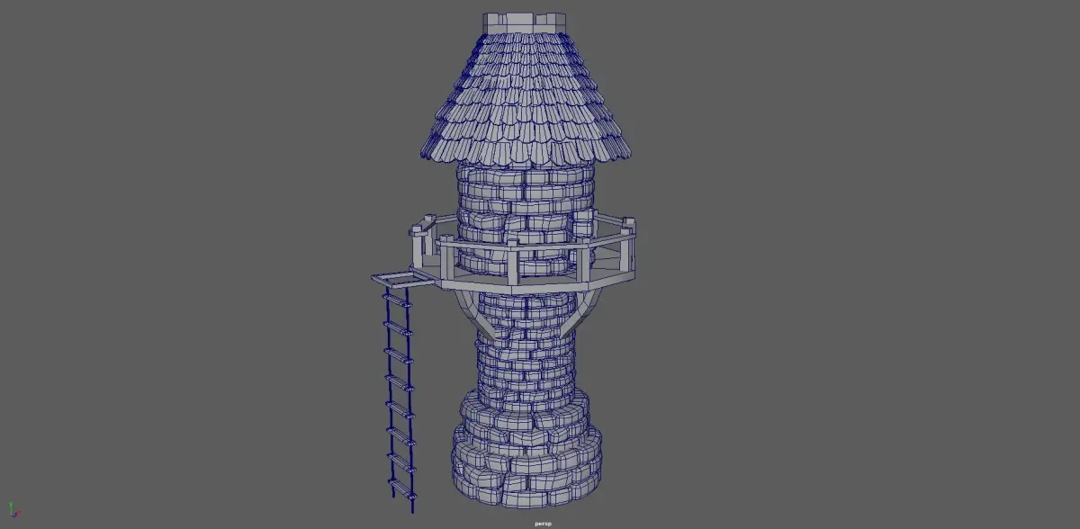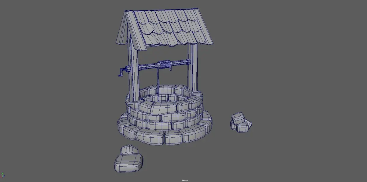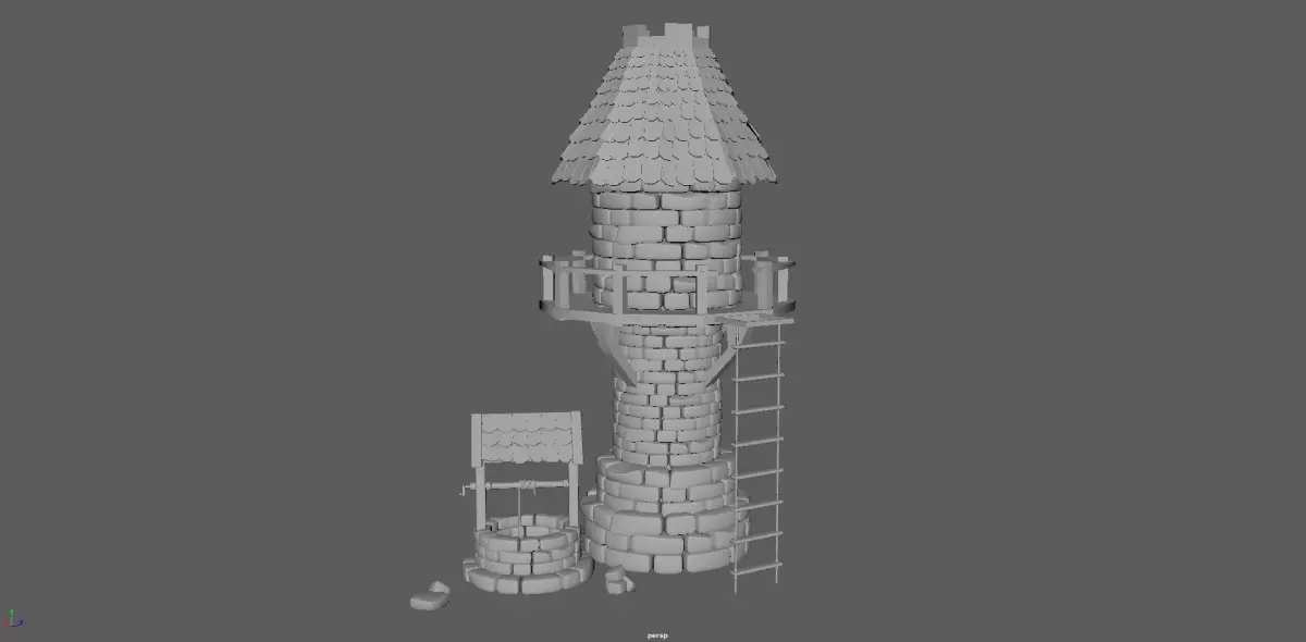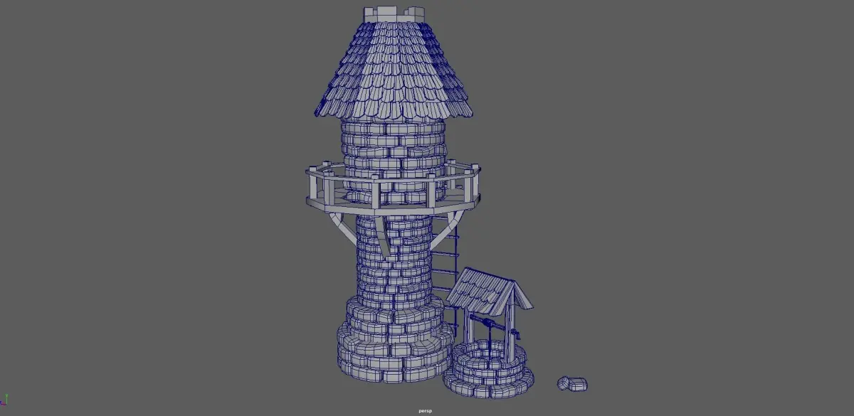 Tower with wooden floor and stairs, opened inside, with roof tiles and upper opening.Water wall with rope and stones, with structure for roof and roof tiles