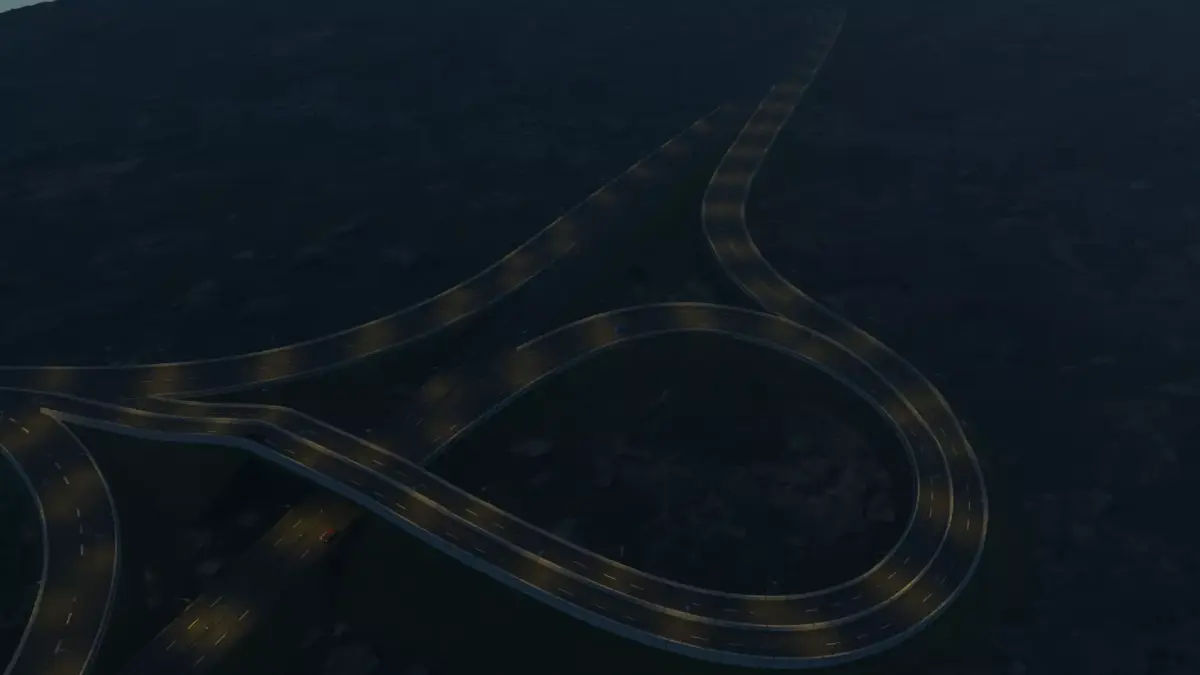 This is a detailed 3D model of a highway trumpet interchange, ideal for infrastructure visualization, urban planning projects, architectural presentations, or traffic simulation.