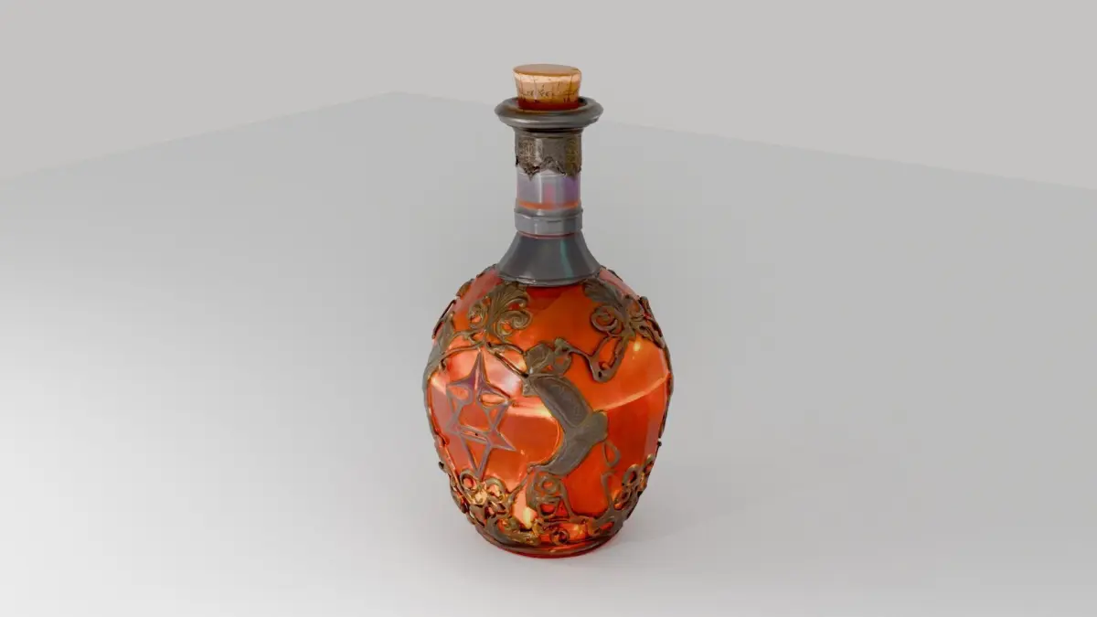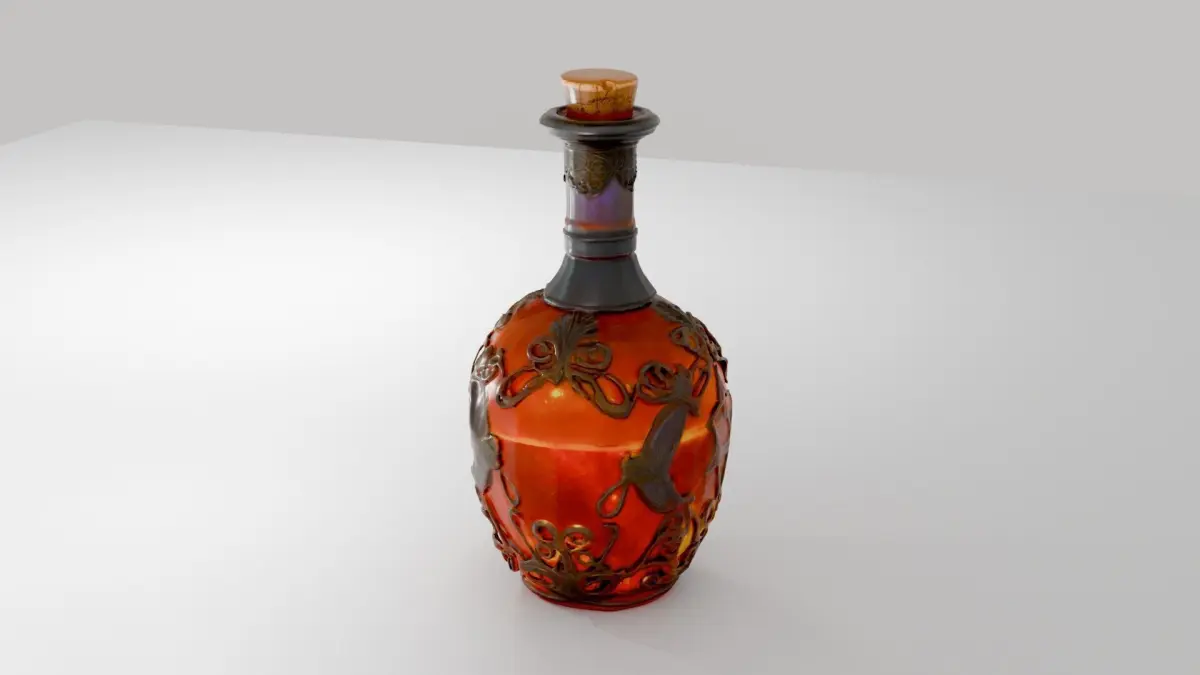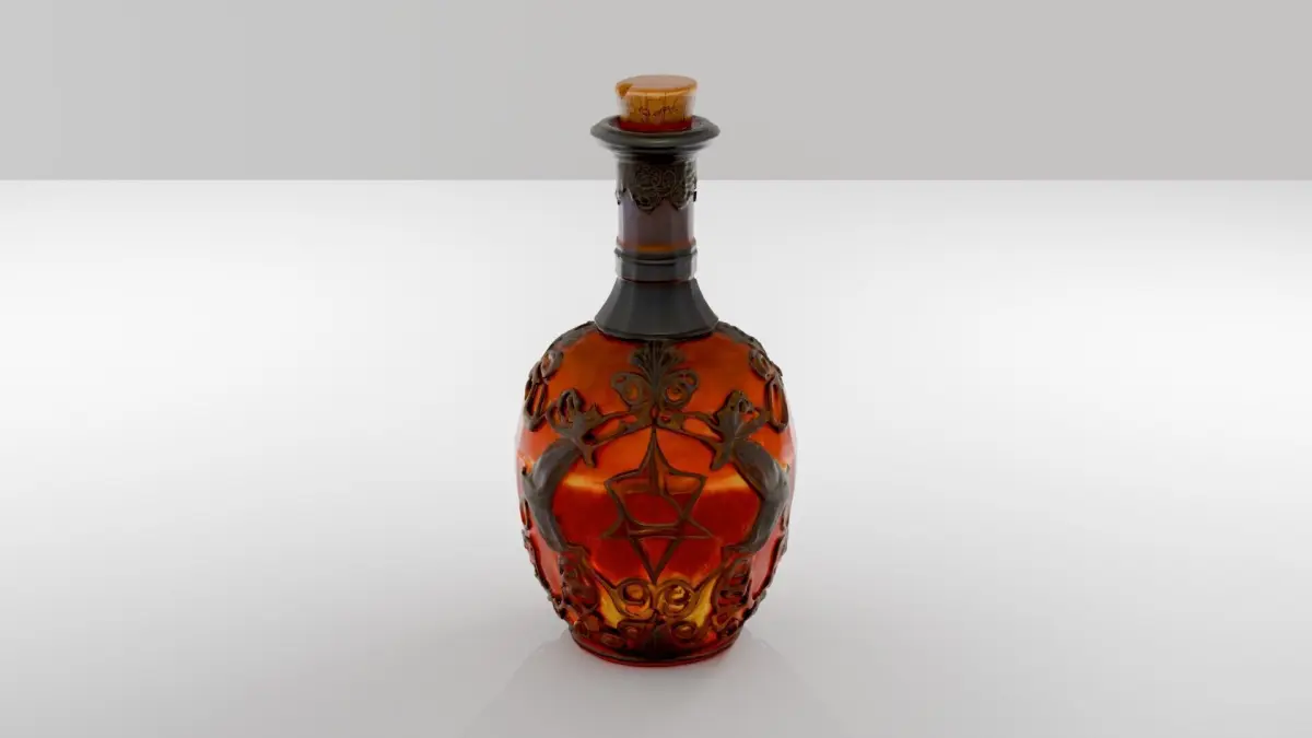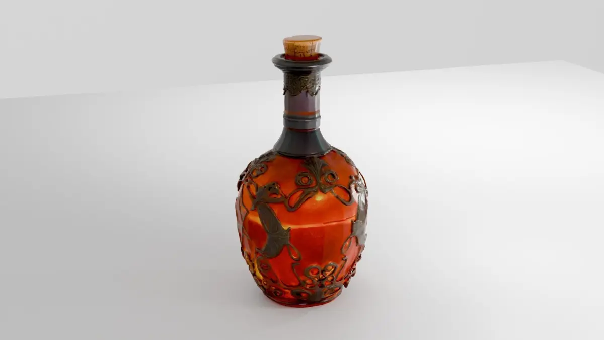 A beautifully **detailed, high-quality **3D **model of a vintage decorative **glass bottle with intricate embossed ornamentation and a luxurious antique cork. Ideal for interior visualization, product renderings, collectibles, animations, gaming, and virtual reality experiences.