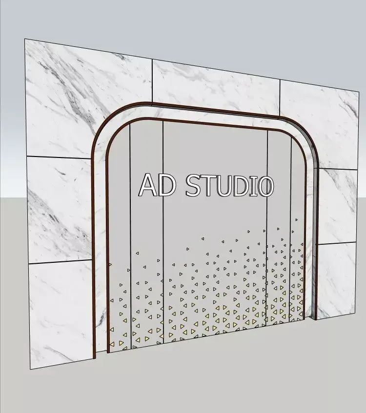 This 3D model showcases a modern wall decoration design, featuring a clean and stylish decorative arch with a geometric pattern. Designed specifically for cafes, studios, and modern interior spaces, this piece blends functionality with aesthetic appeal. The marble background accentuates the intricate design, perfect for enhancing interior walls. The model includes the 3D file in SketchUp format, which can be exported to various other formats including FBX, making it compatible for rendering in software like 3ds Max, Blender, and others. This stylish and customizable decoration can be used in architectural renderings, visualizations, and interior design projects.