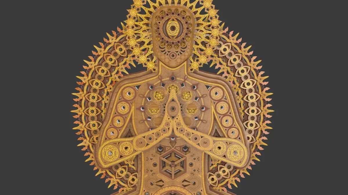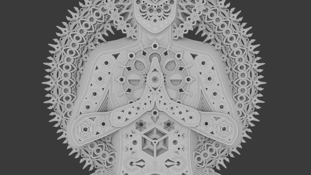 A beautiful 3D wall sculpture of a meditating figure. The figure's body is covered with intricate patterning made up of basic geometries, fractals, the moon phases, hyper cubes, the seed of life, toruses and much more