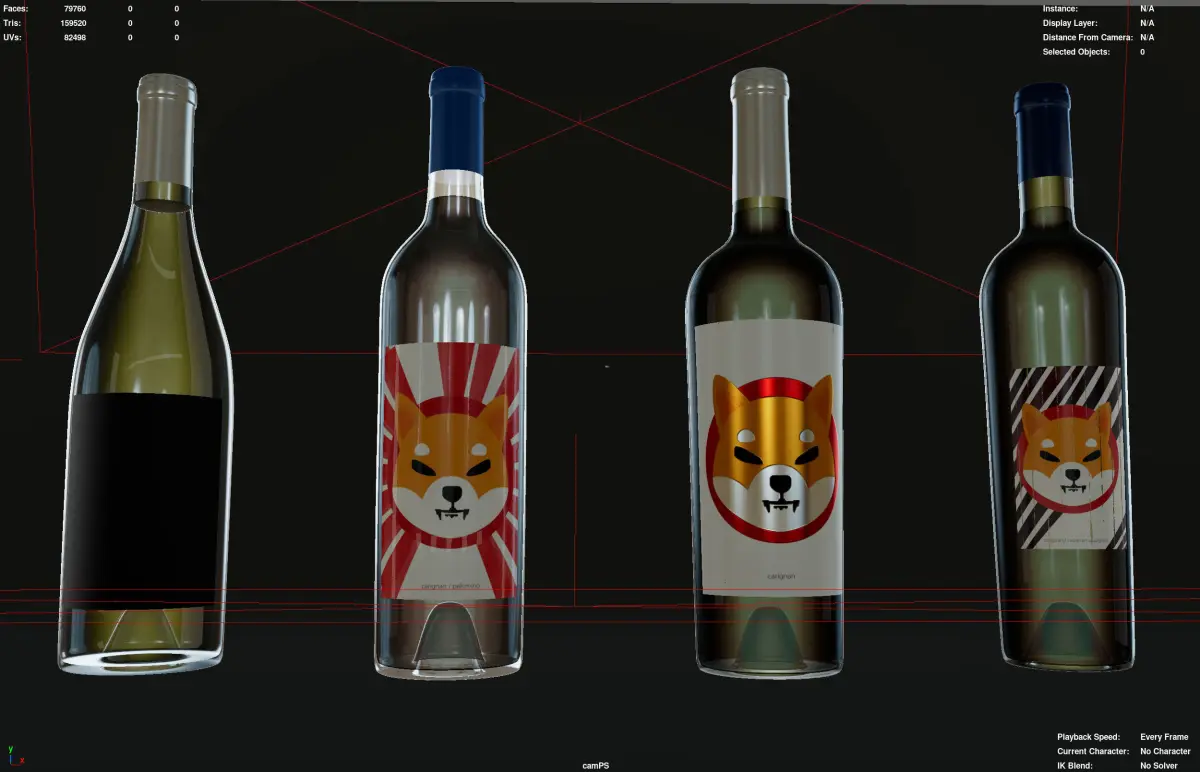 3d wine bottles (1 object for white wine, 1 rose and 2 for red wine). The models include the wine capsule (foil on the top of the bottle), the wine 'liquid' model for refractions and labels. All objects have UVs (one bottle, one label and liquid as separated maps) and the maya scene includes a basic ligh rig and arnold shaders, as seen on the rendered frame.