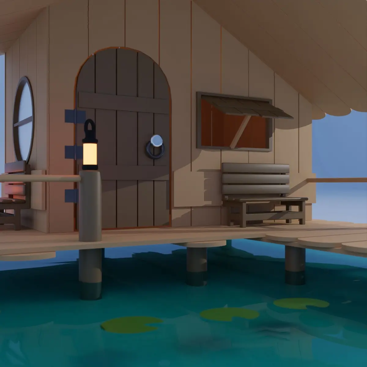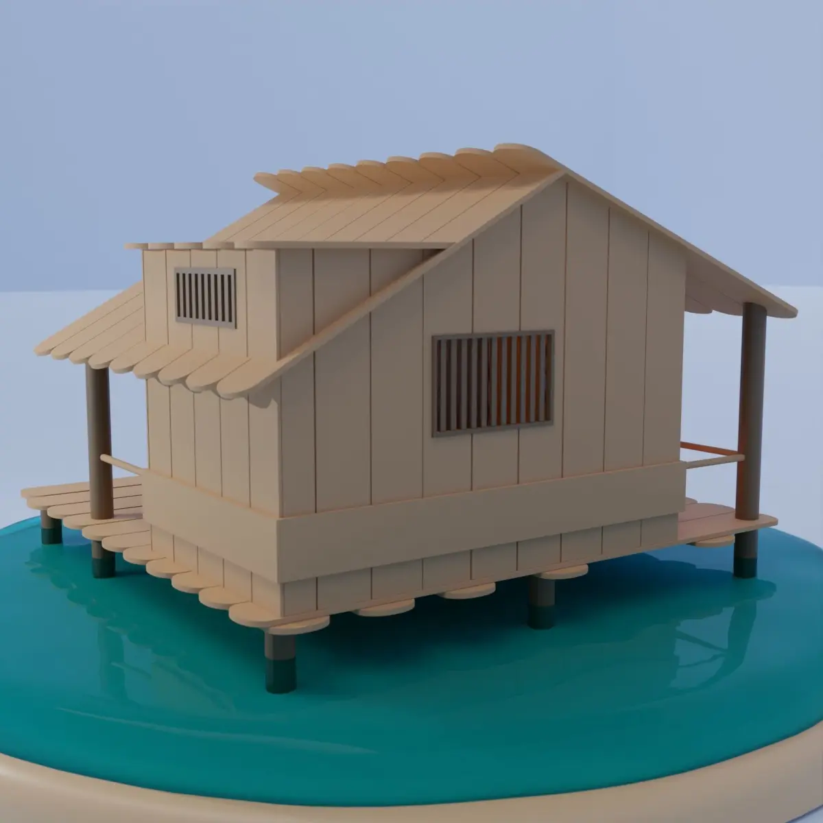 A wooden house built in a swamp There is a material similar to popsicle stick as a component.