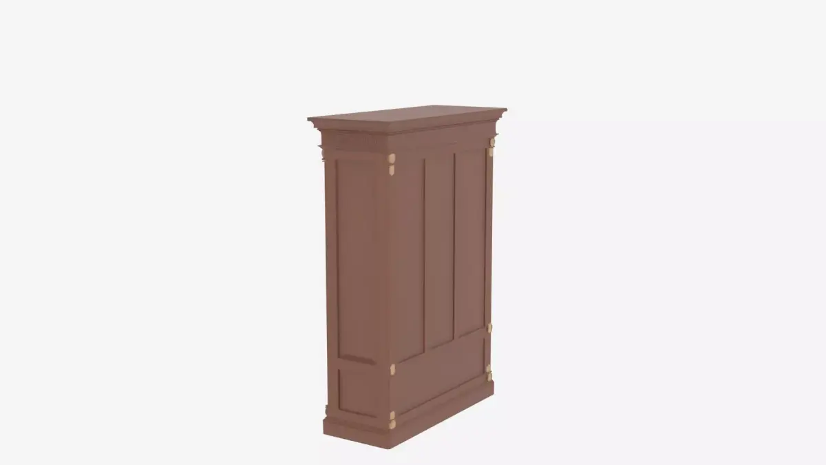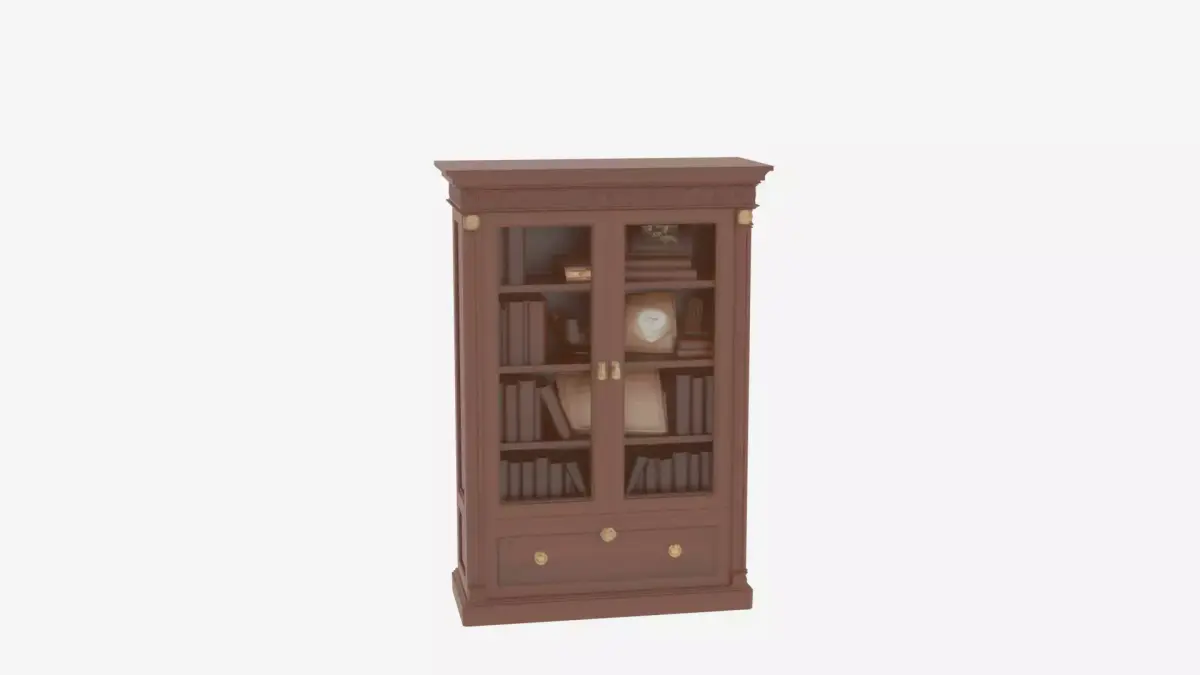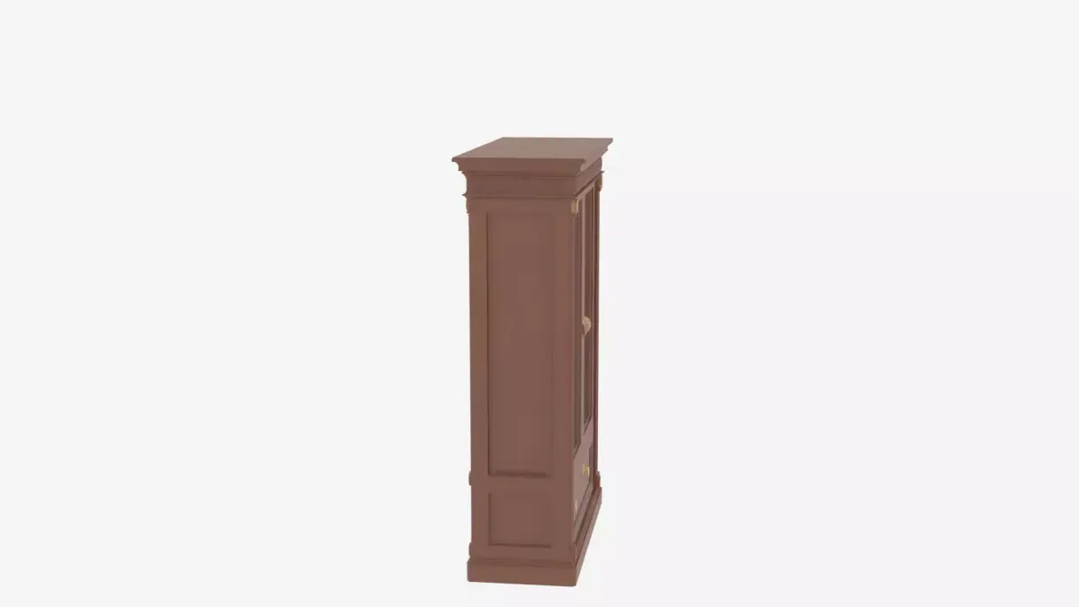 An elegant wooden bank manager's bookcase featuring exquisite glass doors, adjustable shelves, and ornate brass hardware. The piece showcases detailed crown molding and provides ample office storage. This high-quality 3D model captures four essential perspectives: the front display with glass doors, the back construction details, the left side showing depth and molding profile, and the right side highlighting hardware and shelf configurations. Perfect for adding sophisticated executive furniture to any game environment or animation scene.