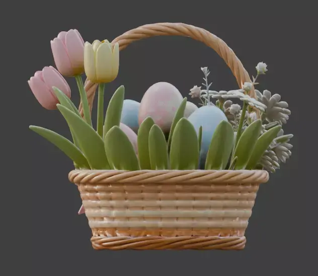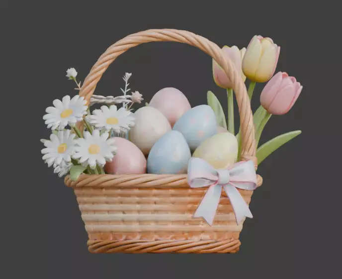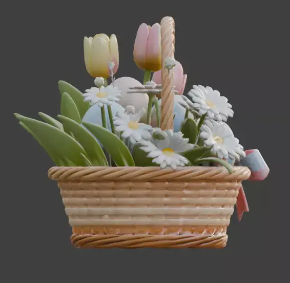 TAGSEaster Basket, 3D Model, Woven Basket, Wicker, Easter Egg, Decorated Egg, Spring Flowers, Tulip, Daisy, Blossom, Festive, Holiday, Pastel, Pink, Blue, Yellow, Ribbon, Bow, Celebration, Springtime, Cute, Gift, Rendering, Digital Art, Game Asset, Realistic Texture, Seasonal Decoration, Floral Arrangement.