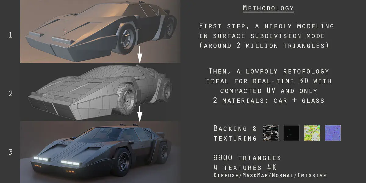 This futuristic CAR n°1 was designed in optimized 3D (only 9900 triangles), baked from a highpoly car with optimized UVs and a rich normal map. Ideal for populating a futuristic city, in a video game, or your personal projects.The native blender format contains PBR textures (Unity HDRP) and shading ready to use in EEVEE or CYCLES.Enjoy !