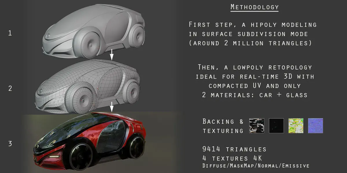 This futuristic CAR n°4 was designed in optimized 3D (only 9414 triangles), baked from a highpoly car with optimized UVs and a rich normal map. Ideal for populating a futuristic city, in a video game, or your personal projects.The native blender format contains PBR textures (Unity HDRP) and shading ready to use in EEVEE or CYCLES.Enjoy !