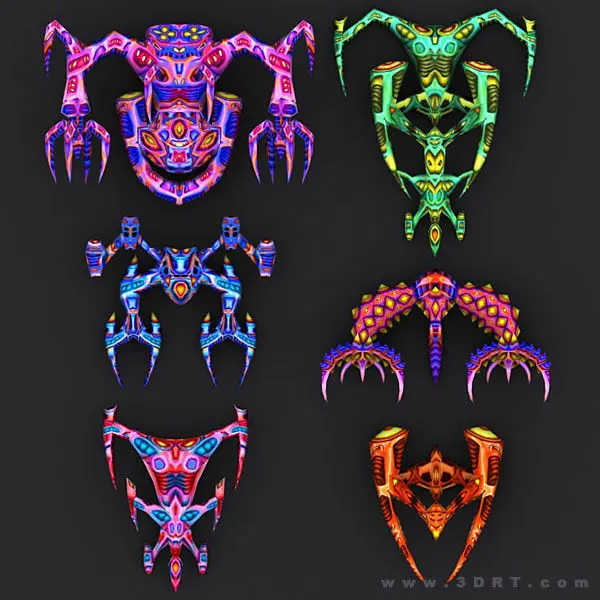 .3ds .dae (Autodesk) .dae (Collada) .dts (Torque engine) .fbx .mb (Maya) .ms3d (Milkshape3D) .obj .x (DirectX) Extreme lowpoly pack suitable for mobile iPhone games and light applications. average polygon count: Bosses ~400-1000 Ships ~100-200 10 bright + 8 dark skin styles interchangeable between all ships. All models are textured with 1 (512x512) pattern that saves texture memory dramatically. .PSD file included for texture editing and customization.