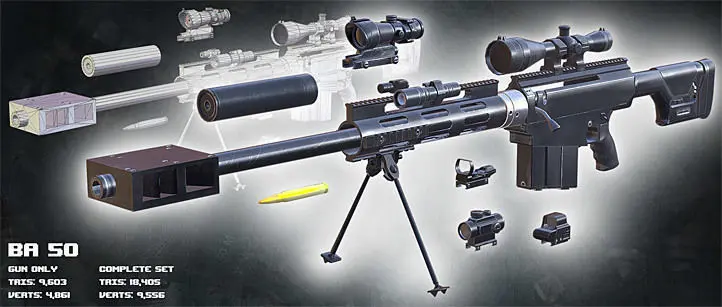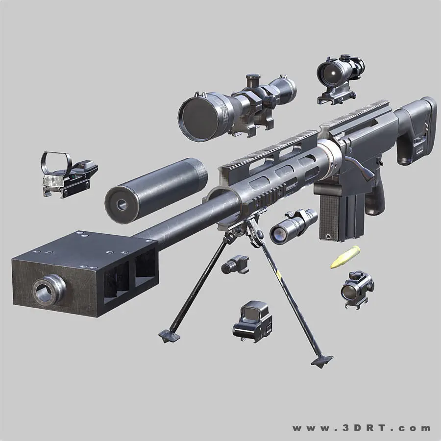 - removable accessories: 2 barrels, silencer, scope, holographic sight, red dot sight, reflect sight, ACOG, flash light, tactical laser, magazine, bipod.