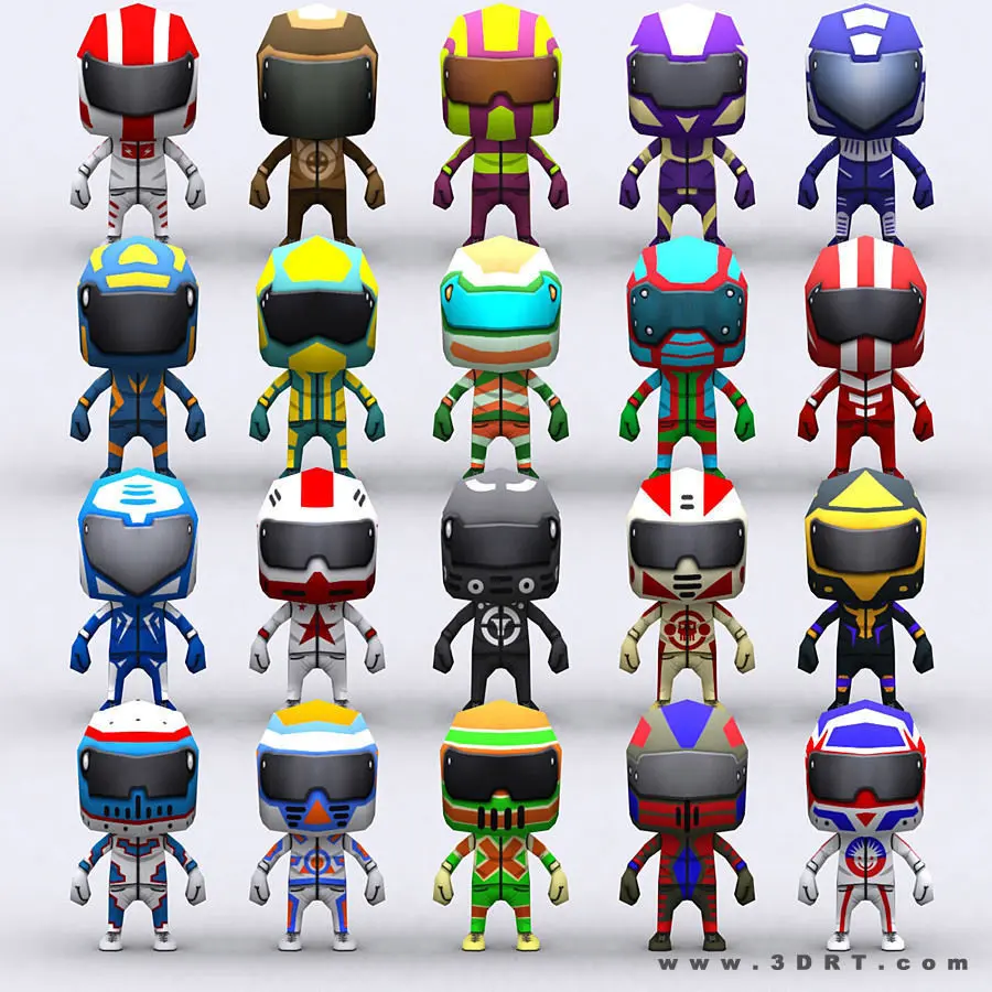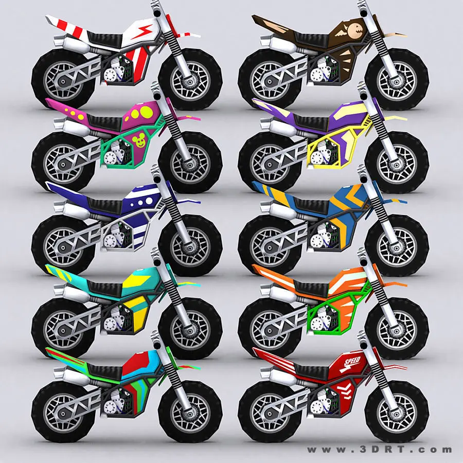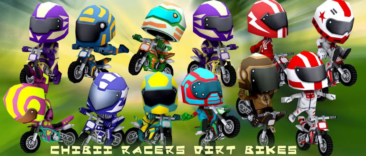 Chibii racers dirt bikes. Animated lowpoly 3d pack optimized for mobiles.10 bike skins, 20 chibii racers skis.2048x2048 .png texture source files included.Available in a Chibii racers bundle.