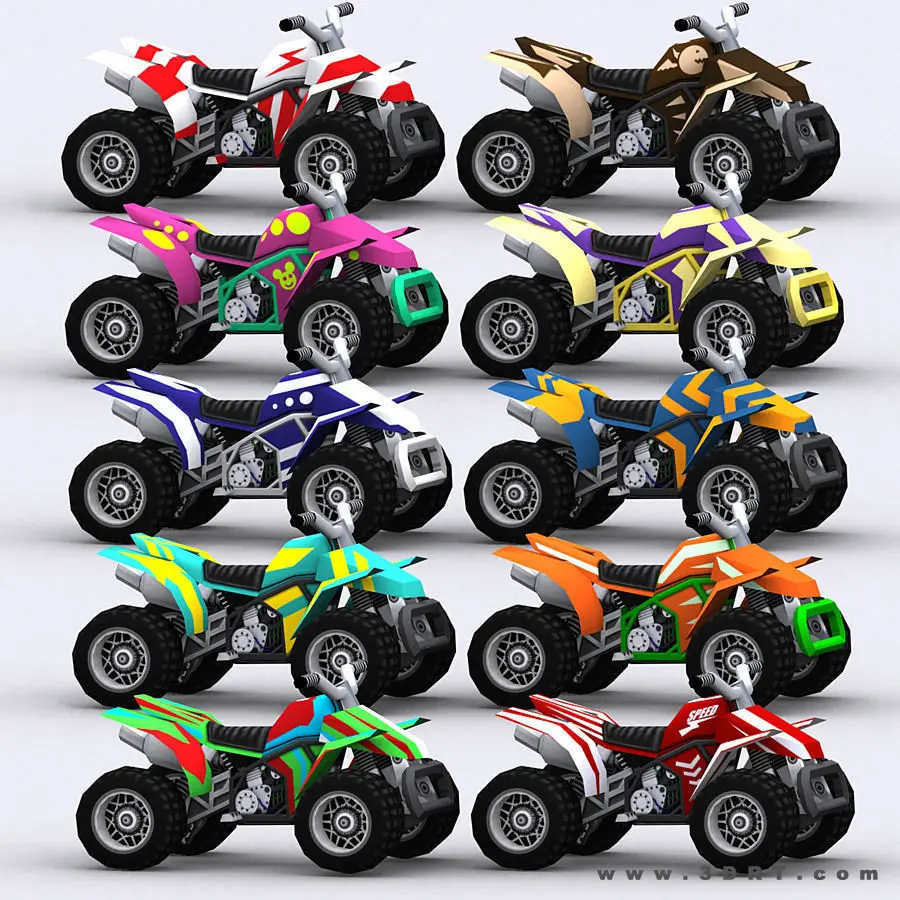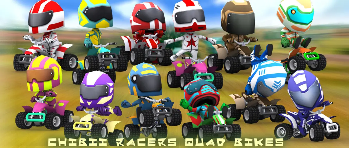 Chibii racers quad bikes. Animated lowpoly 3d pack optimized for mobiles.10 bike skins, 20 chibii racers skis.2048x2048 .png texture source files included.Available in a Chibii racers bundle.