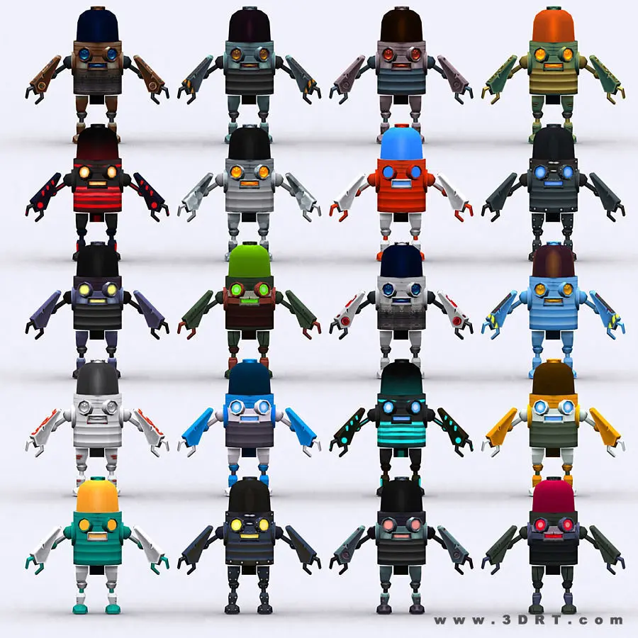 Chibii Robot -20 lowpoly 3d animated pack. -20 skins versions -2048x2048 diffuse .jpg textures. Available in a Chibii Robots bundle pack.