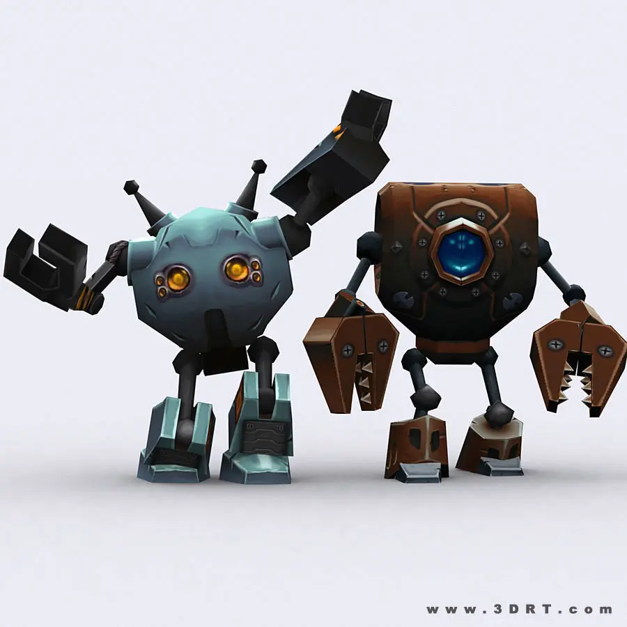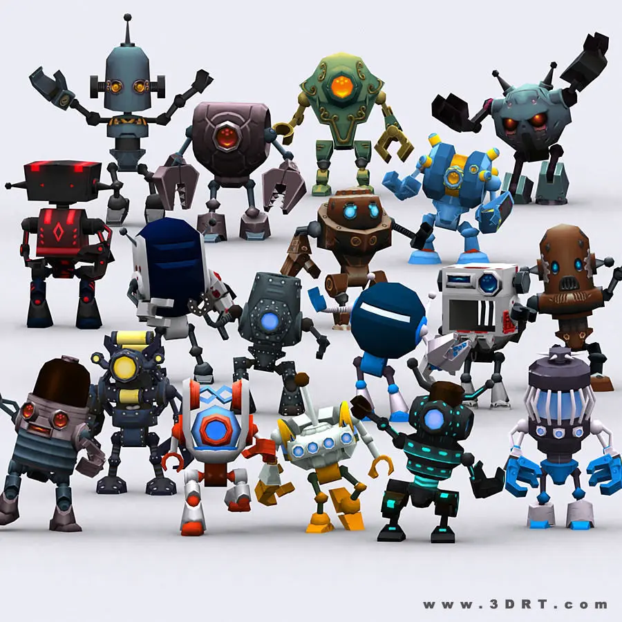 Chibii Robots lowpoly 3d animated pack. -20 mesh designs -20 skins versions for each -2048x2048 diffuse .jpg textures. - switchable legs and arms - thousands of custom variations 109 animations: