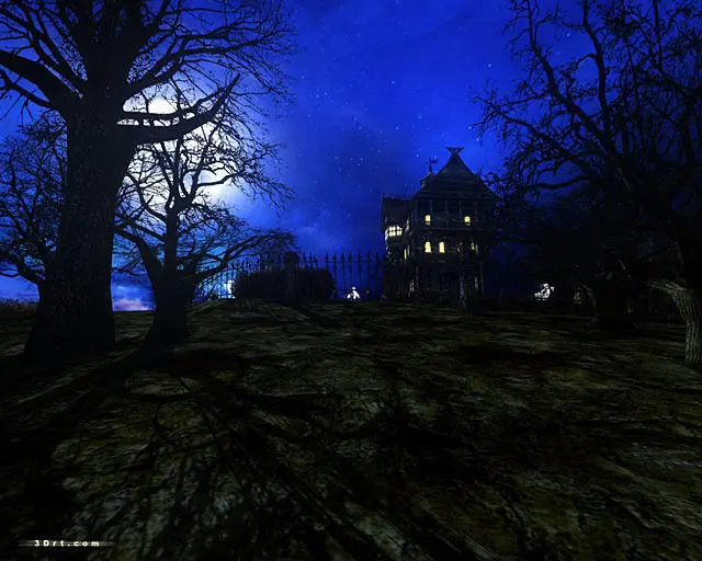 Creepy Halloween scene of a full moon lit dark mansion in the middle of a dark forest with ghosts flying all around. 11k polygons full scene. High resolution textures included: 5-1024x1024, 3-512x512 +5x1024x1024 skybox textures Animated scene with flying ghosts and cameras included (3dsmax7)