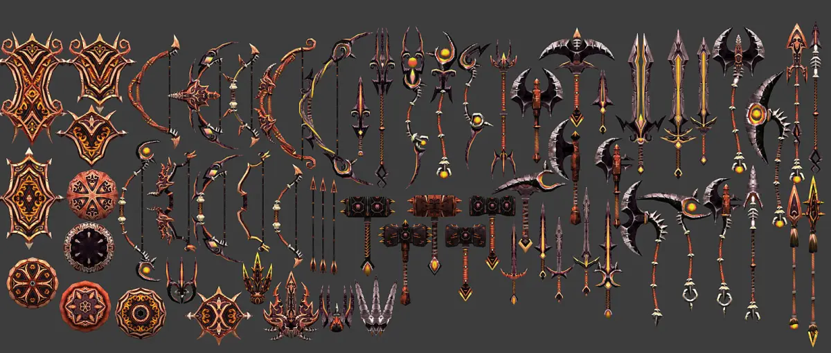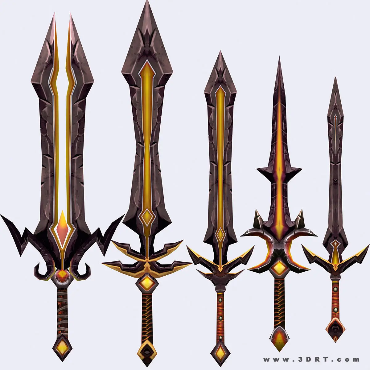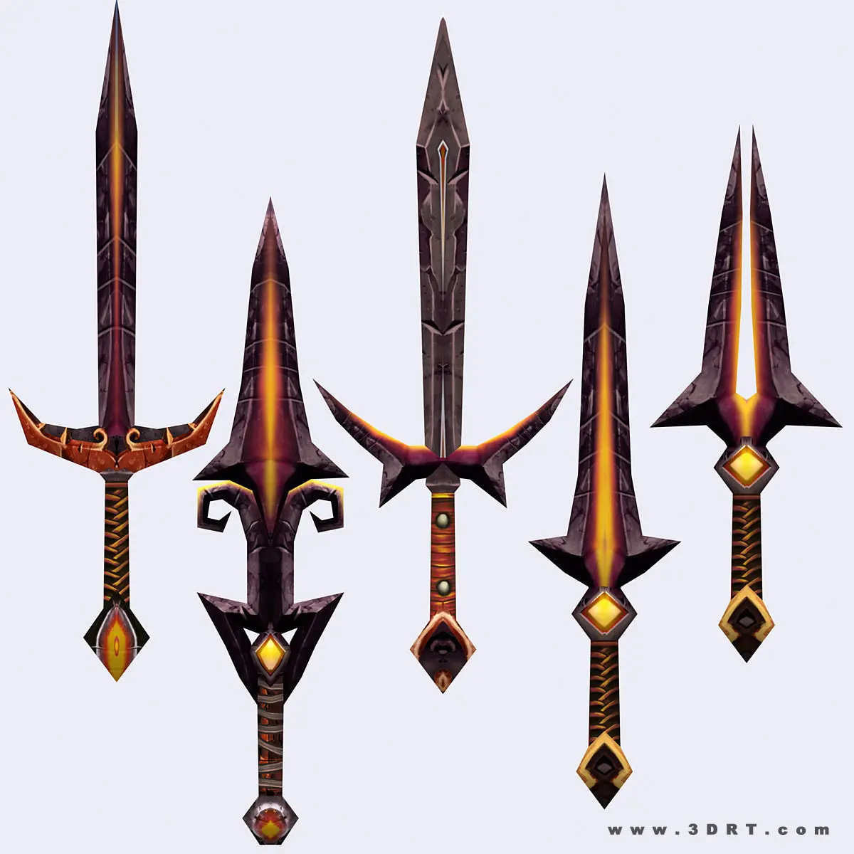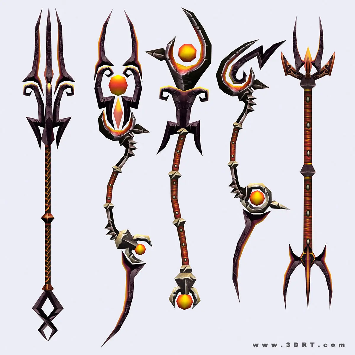 Fantasy arms 3d lowpoly bundle pack. Total 60 models with 10 skin styles. 10 bows, 10 shields, 5 swords, 5 daggers, 5 staves, 5 spears, 5 axes, 5 long axes, 5 hammers, 5 claws. Normal spec and displacement maps included. 2048x2048 single texture pattern shared for all the weapons. ~200-900 triangles per model. Optimized for mobile applications.
