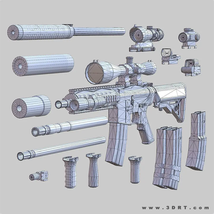 - removable accessories: x3 silencers, scope, holographic sight, red dot sight, reflect sight, tactical laser, acog, x2 magazines, double magazine, sights holder, x3 grips, flashlight.