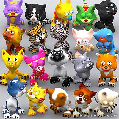 Fully rigged and animated 3D cartoony cats megapack. Optimized for real-time engines and suitable for high quality renders. 3 mesh models+ 20 textures skins for each (1024x1024) over 60 animations
