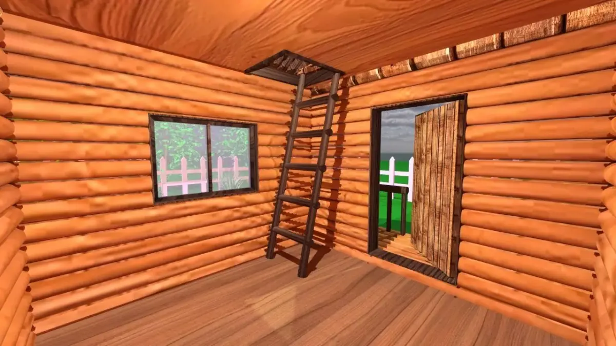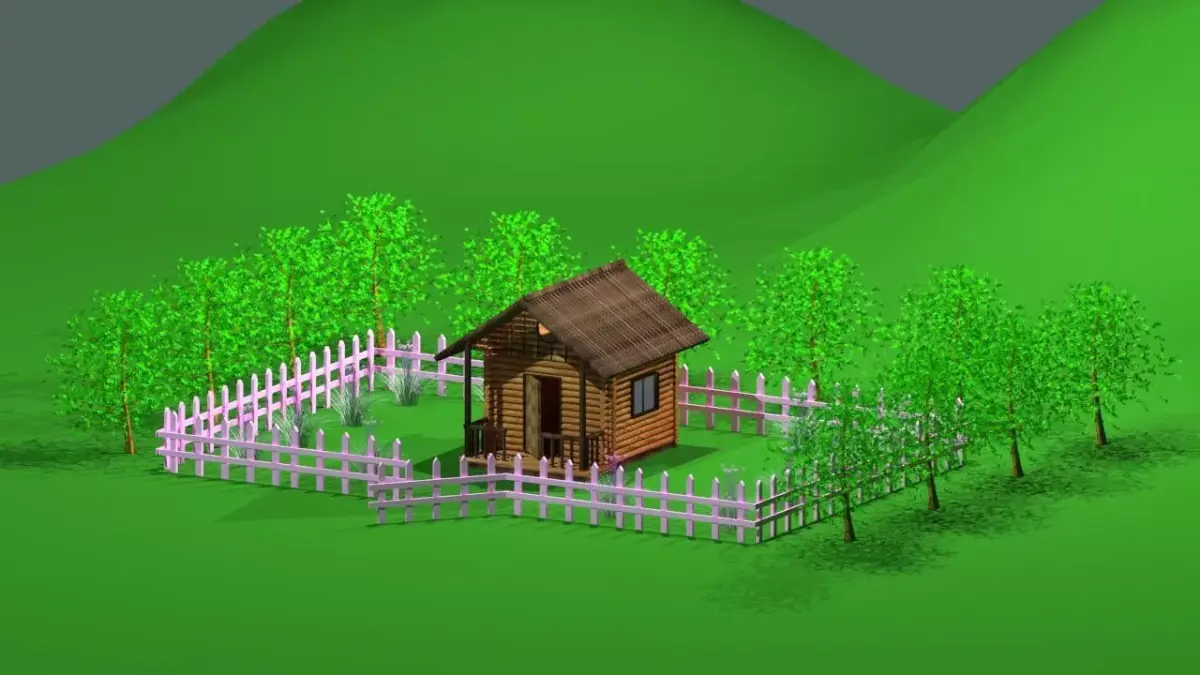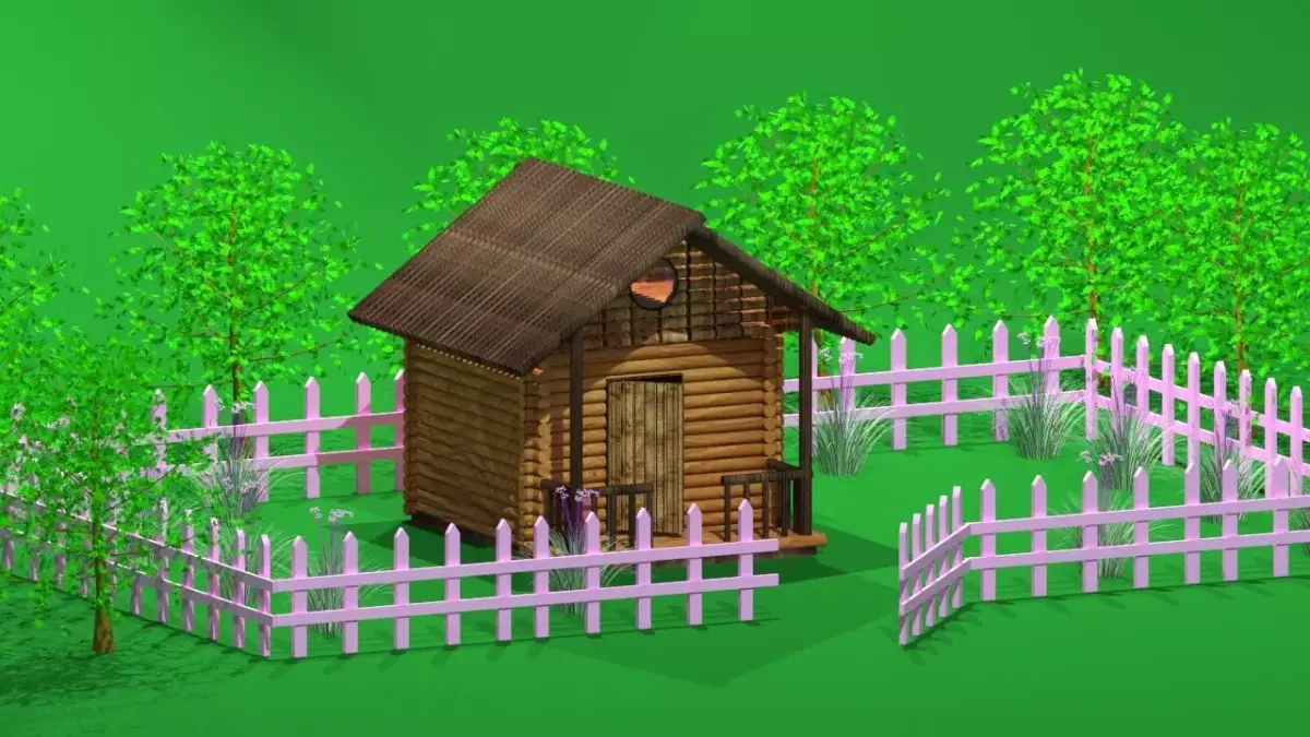 This high-quality 3D model represents a charming wooden cottage located in a natural meadow environment, designed for realistic outdoor scenes. It includes a wooden fence surrounding the house, garden flowers in the yard, and trees placed around the outer landscape.