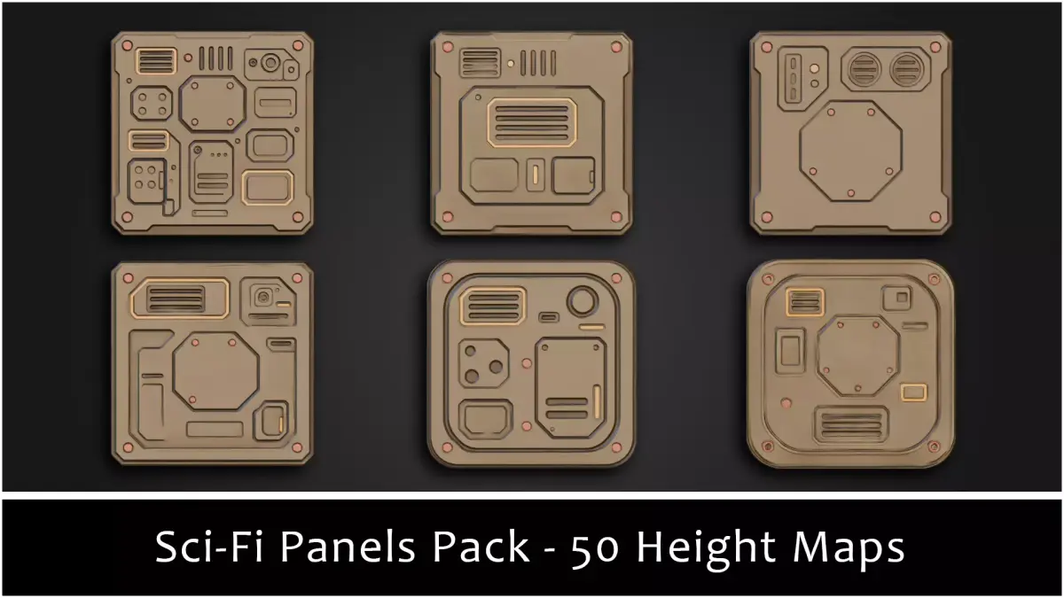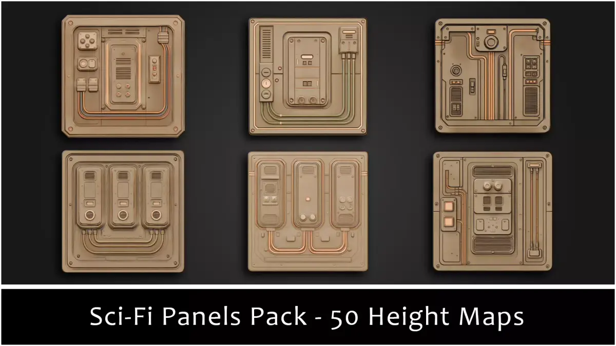 - 50 Stylized Height Stamps. Vents, reactor frames, cable panels, access ports, biohazard/radiation/utility icons, direction arrows, warning plates, fans, grille doors, and panel crests—engineered to drop straight into your pipeline.