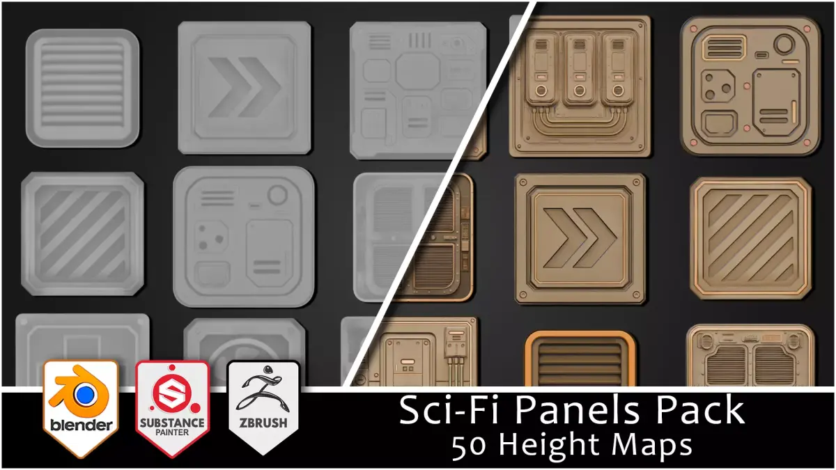 The 3DT Sci-Fi Ornamental Pack delivers 50 stylized designs—reactor plates, hazard icons, louvered vents, conduit panels, service hatches, warning placards, chevrons, fans, and alloy insignias—each with height, color, and mask maps for Blender, Substance Painter, and beyond.
