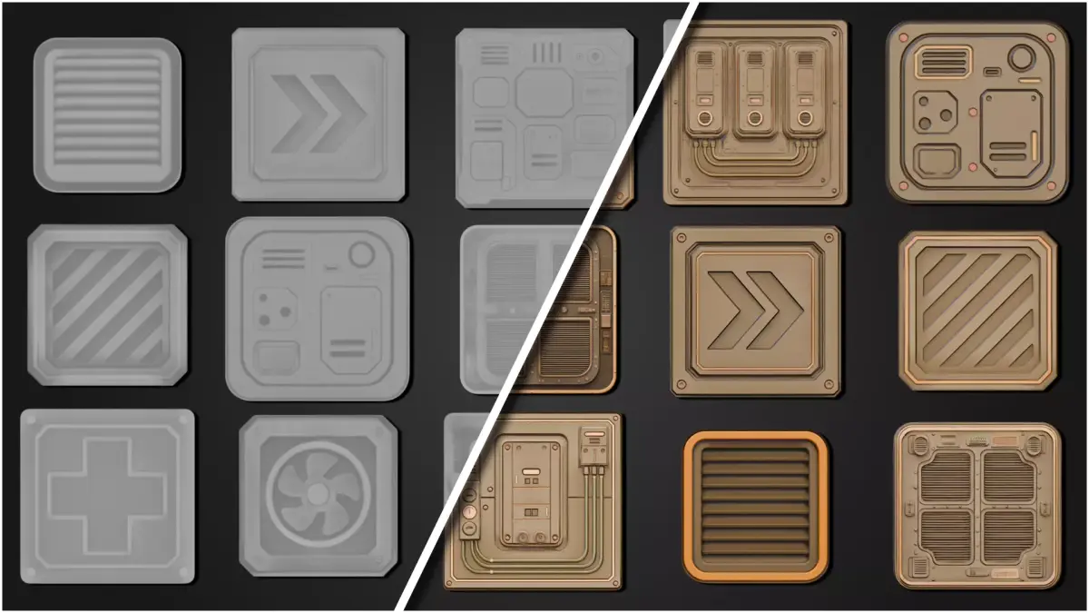 - Material overlays – Mix height and color into shaders to emboss console plates, brand cargo crates, and engrave mech armor.