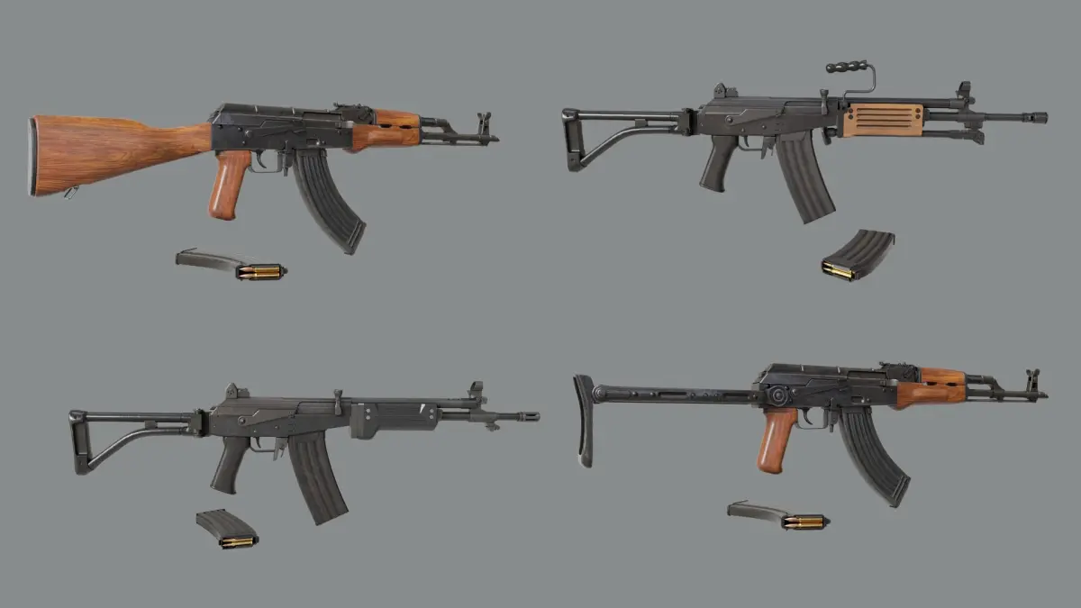 The Photorealistic 3D model of 4 Machine Guns AKM and Galil Generic 3D Model. This model is suitable for any visual production - broadcast, high-res film close-ups, advertising, games, design visualization, forensic presentation, etc.