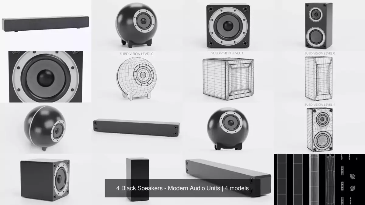 A set of four black, no-brand audio units, covering key types for home theater, studio, or interior visualization. This collection includes a sleek soundbar, a round speaker, a cube-shaped subwoofer, and a tower speaker. All models are fully optimized with clean topology for real-time use, while 4K PBR textures deliver realistic surface detail and material definition. The minimalist black finish provides a cohesive, neutral look that fits effortlessly into any modern environment, making this set ideal for product renders, AV setups, or interior scenes.