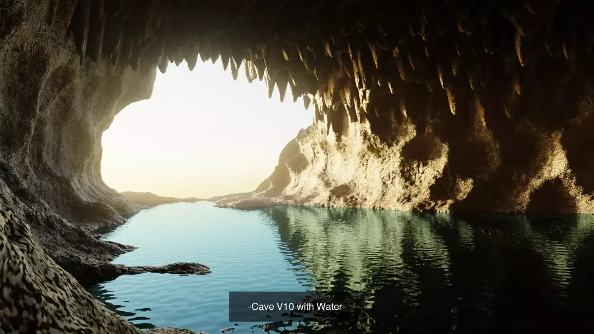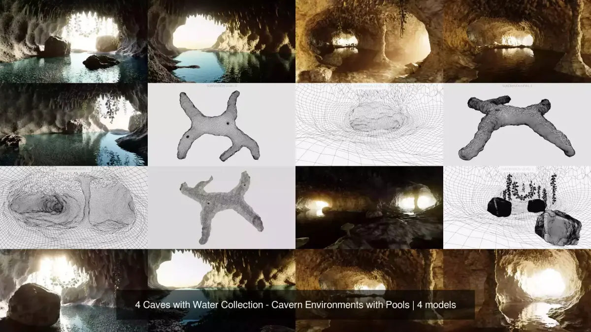 A set of four cave environments featuring integrated water elements, from shallow pools to small interior ponds. Some caves include vegetation, rock formations, and stone columns, adding natural variation. Each environment provides inward depth, structured rock surfaces, and flexible layouts, offering a strong foundation for scene composition, lighting, and material application.