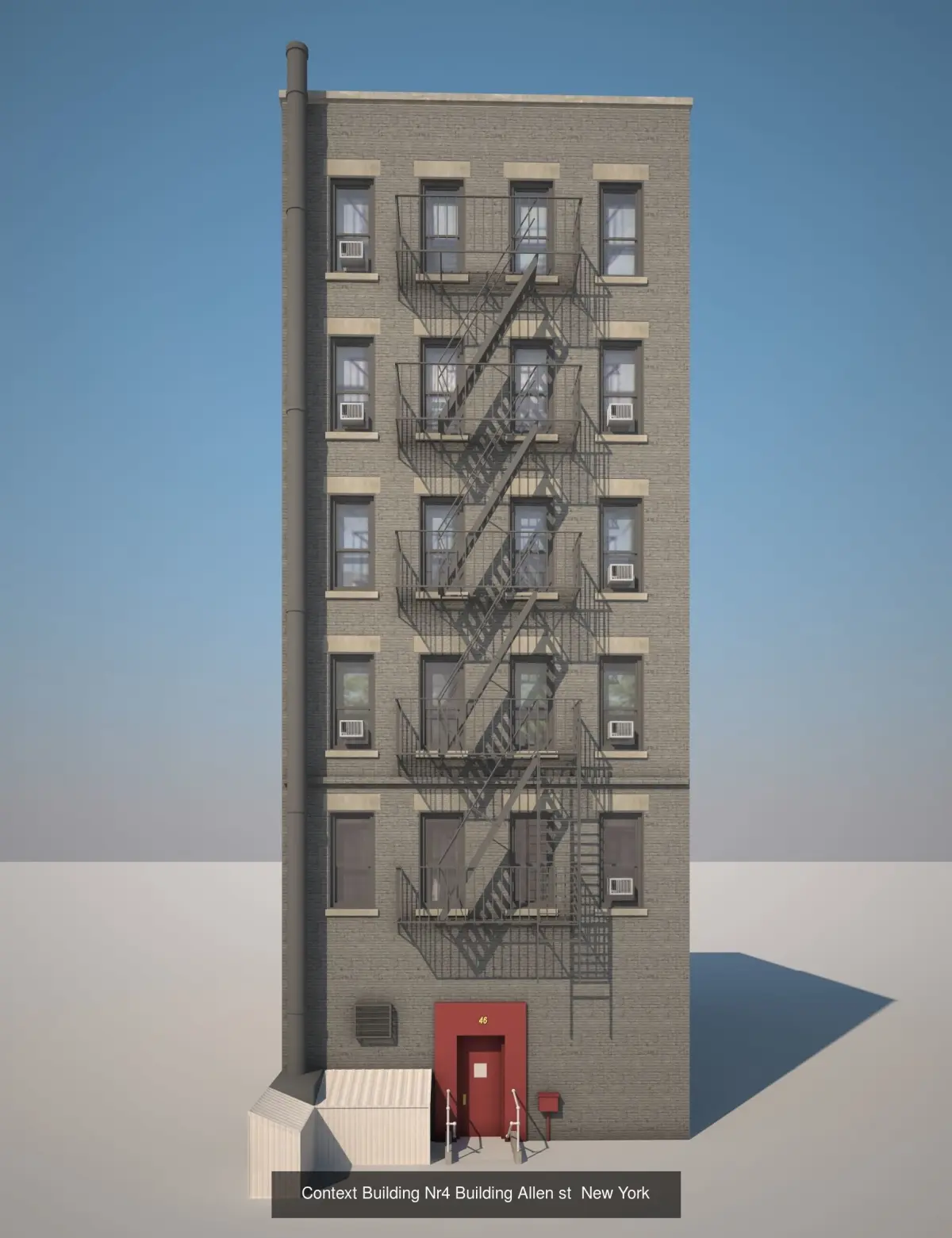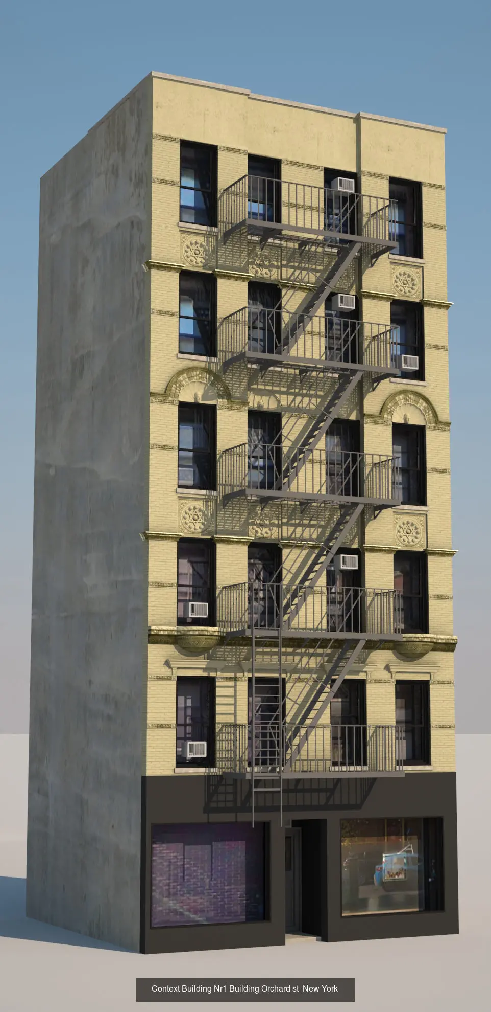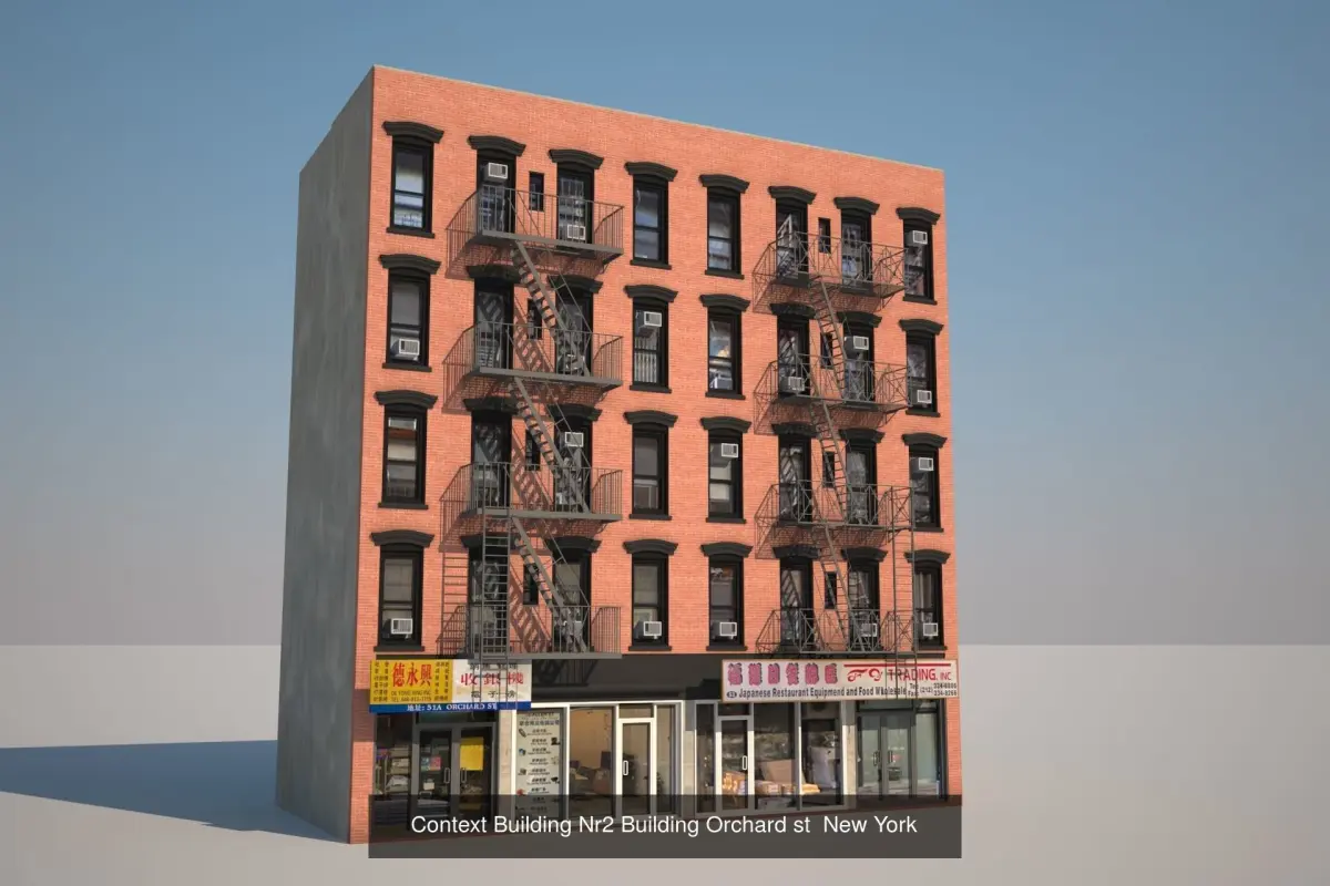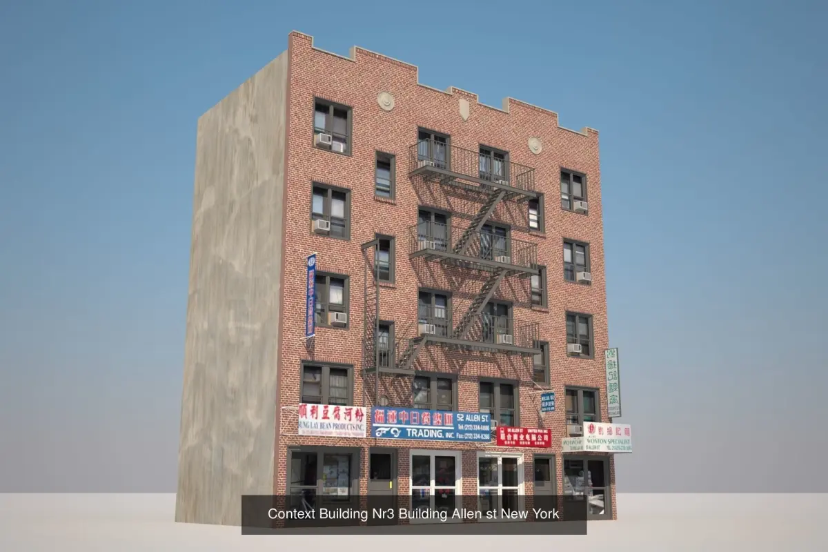 Contains 4 mid-detailed buildings to use as context/entourage for New York, China Town.The interiors are not modeled, just textured with a lowres image. Works great at long distances, not so much at short range distance.