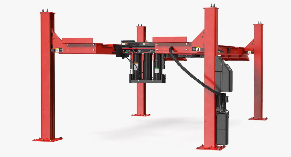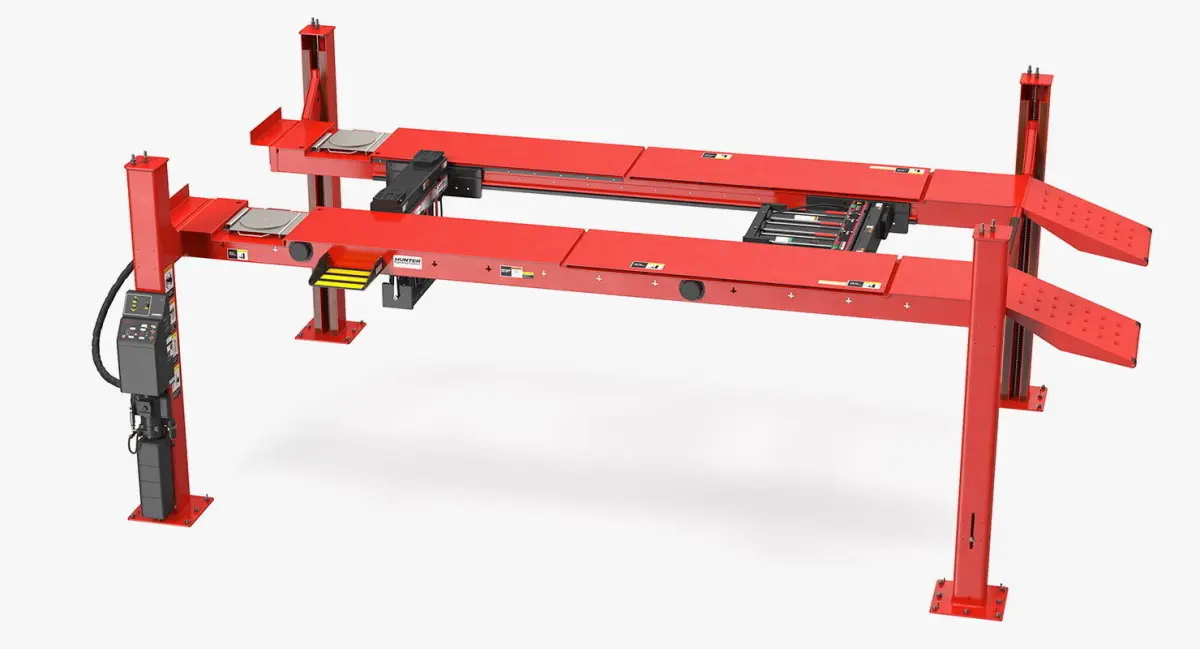 4 Post Car Lift Hunter L451 car service tool or equipment.Four-Post Lift car repair tool with control buttons for pump operating, and raising the car lift. For car service, diesel and gasoline-powered automobiles, car service stations, car shops, gas stations, and car service centers advertising projects.