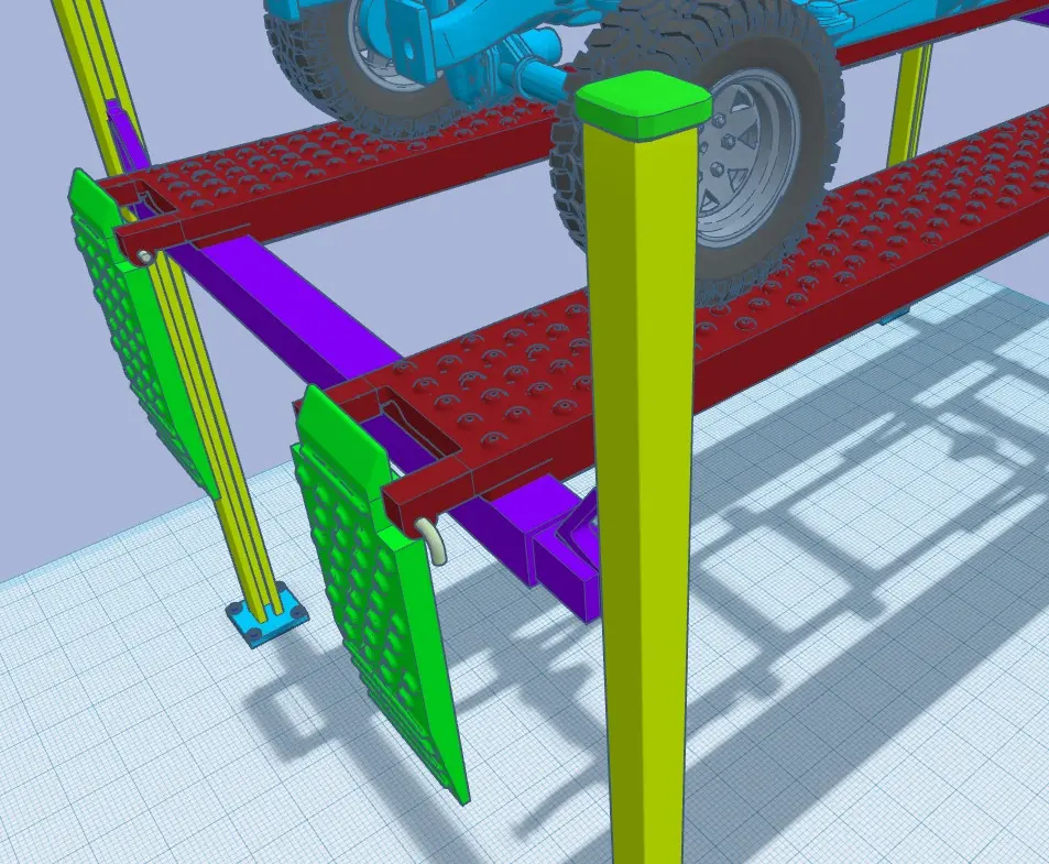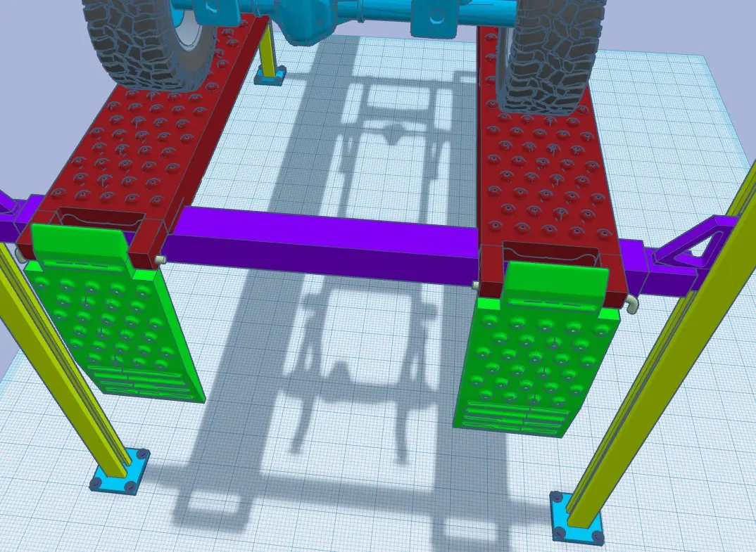 4 post heavy duty car/truck lift, with control panel in 1/25th scale. 3 height spacers, half, three quarters and full height. End ramps swivel down when ramp is raised and has bump stops when in the down position. An option is using styrene rods instead of printing the ramp pins. You can download individual files or 1 zip file.