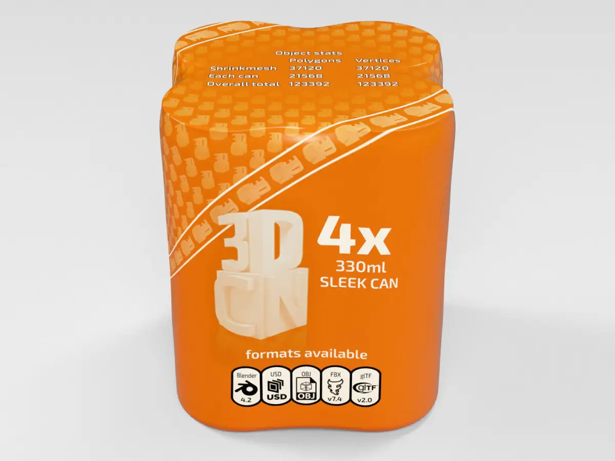 4 pack 330ml Sleek Shrink-wrapped Beverage Cans 3D model available to download in these formats: blender 4.2.7, OBJ, FBX, glTF, USD.