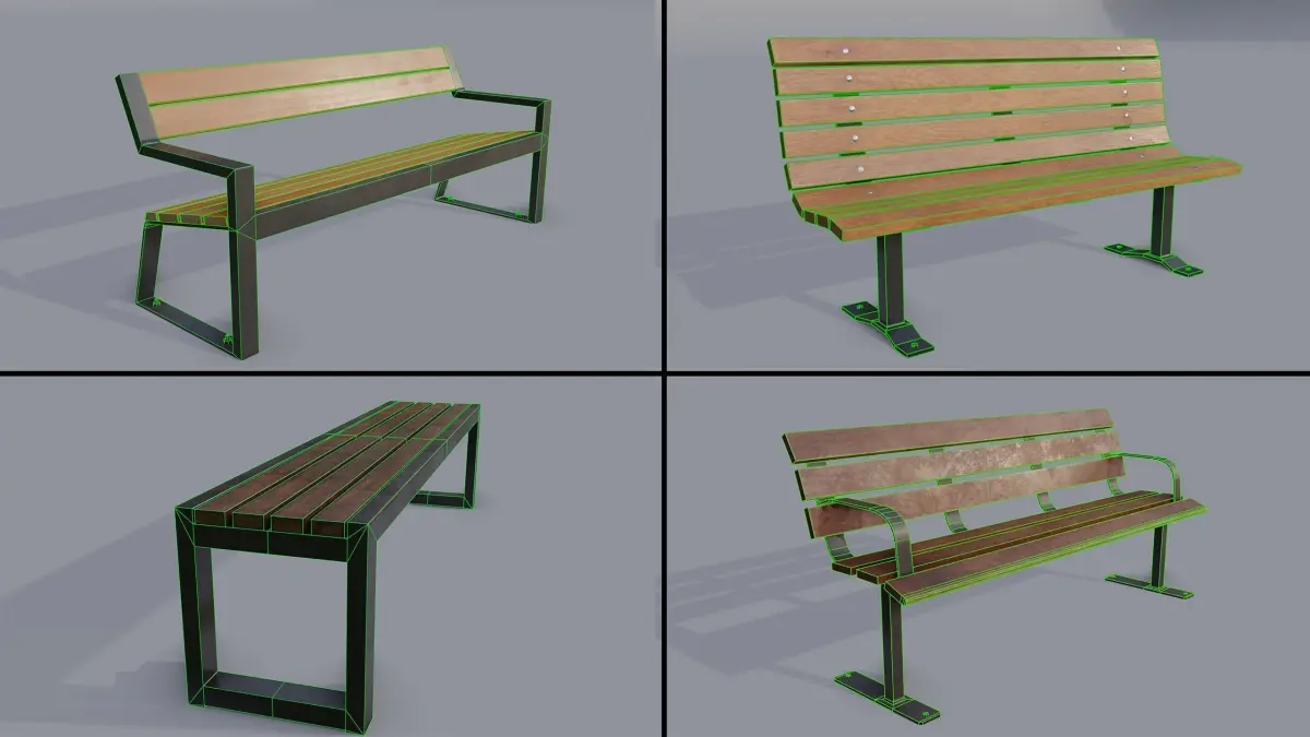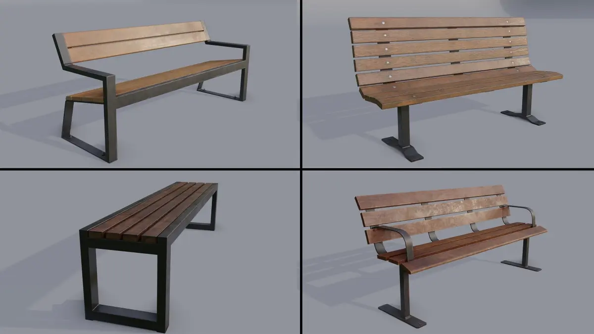 Game ready bench models with PBR textures.