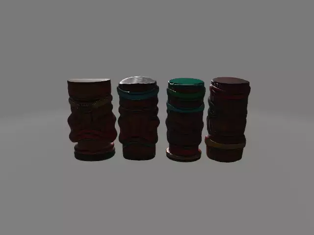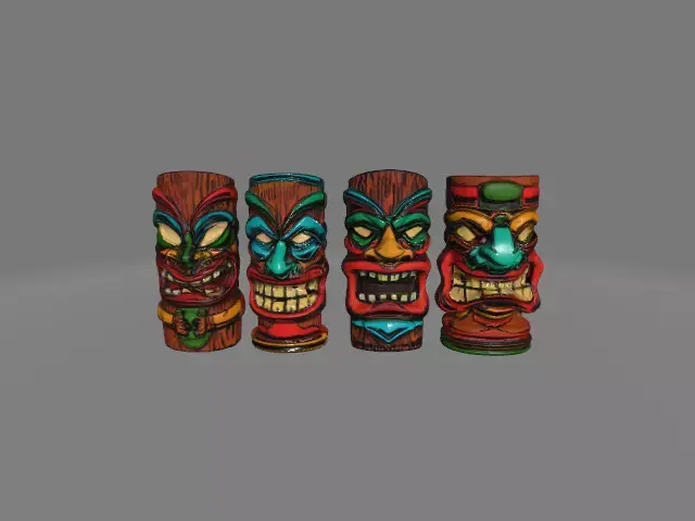 This 3D asset features a set of four highly detailed and stylized Tiki figures, each representing a unique personality or spiritual archetype inspired by Polynesian and Oceanic tribal carvings. These hand-sculpted wooden statues are ideal for adding authenticity and character to jungle temples, island villages, or ceremonial environments.