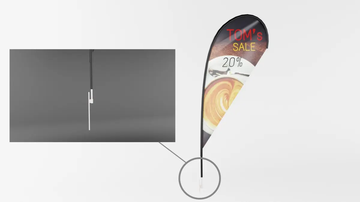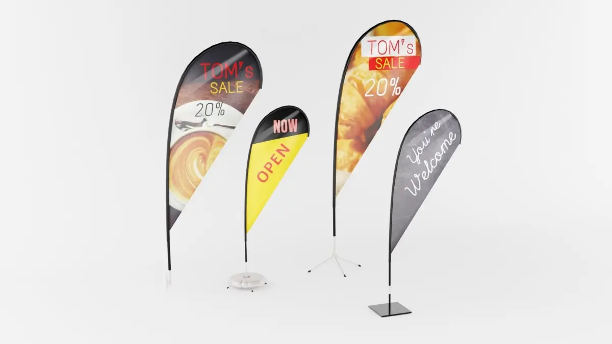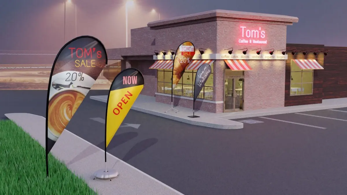 Included: teardrop flags with 4 based types (pin, 4legs, 4legs with weight and squares), restaurant scene