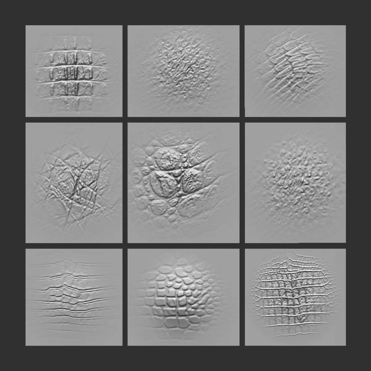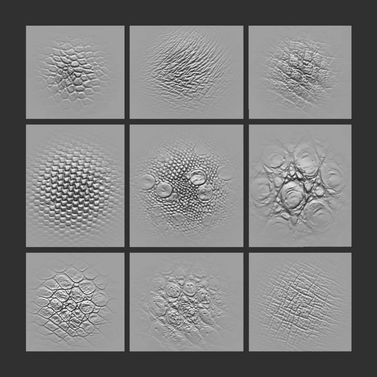 *Note* ; add very small noise for base layer of your skin using zbrush\surface\noise or if you use other software programs add noise mask for micro details in first layer after that you can use these alphas for secondary layer, this technique will help you to achieve more realistic results and adjust alpha intensity according to your project.