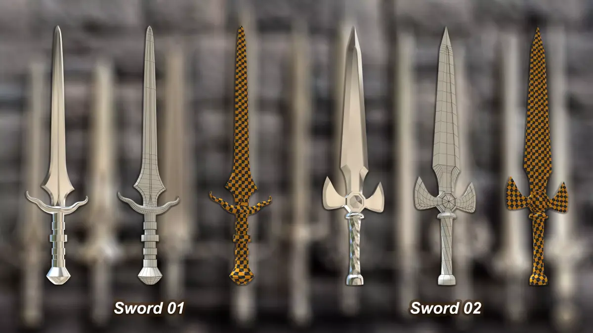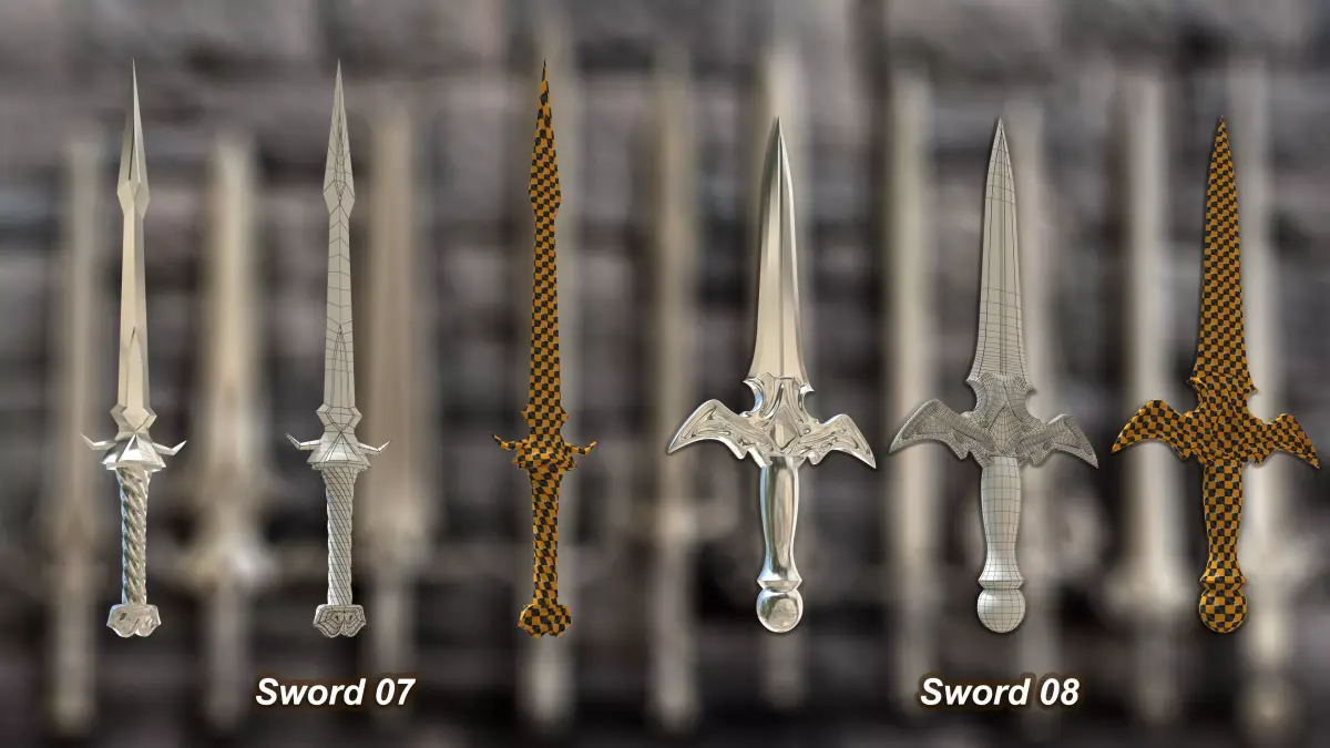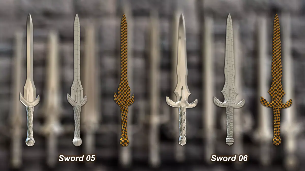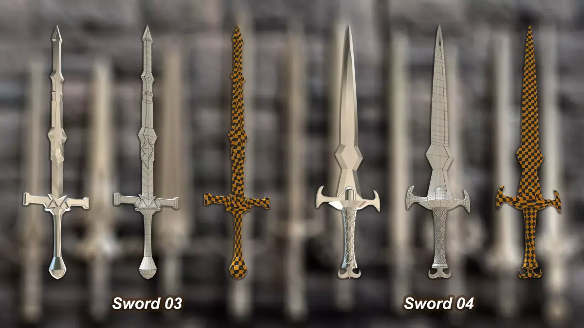 - Each sword is carefully modeled with clean quad topology and minimal triangles, ensuring an optimized balance between high-quality detail and real-time performance.