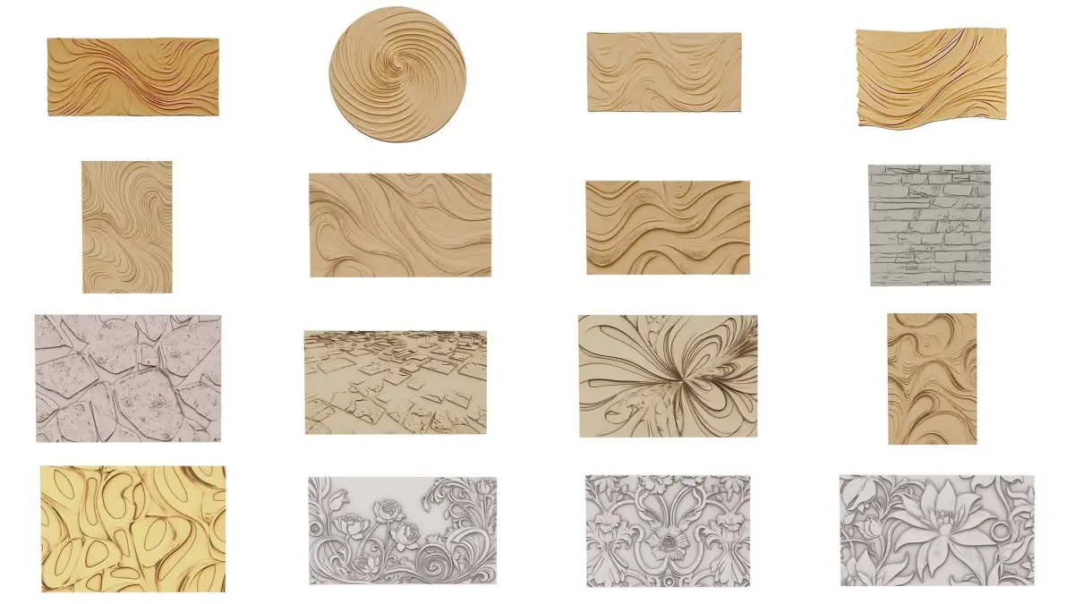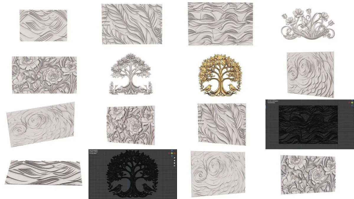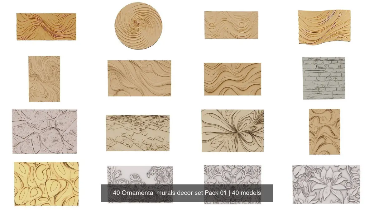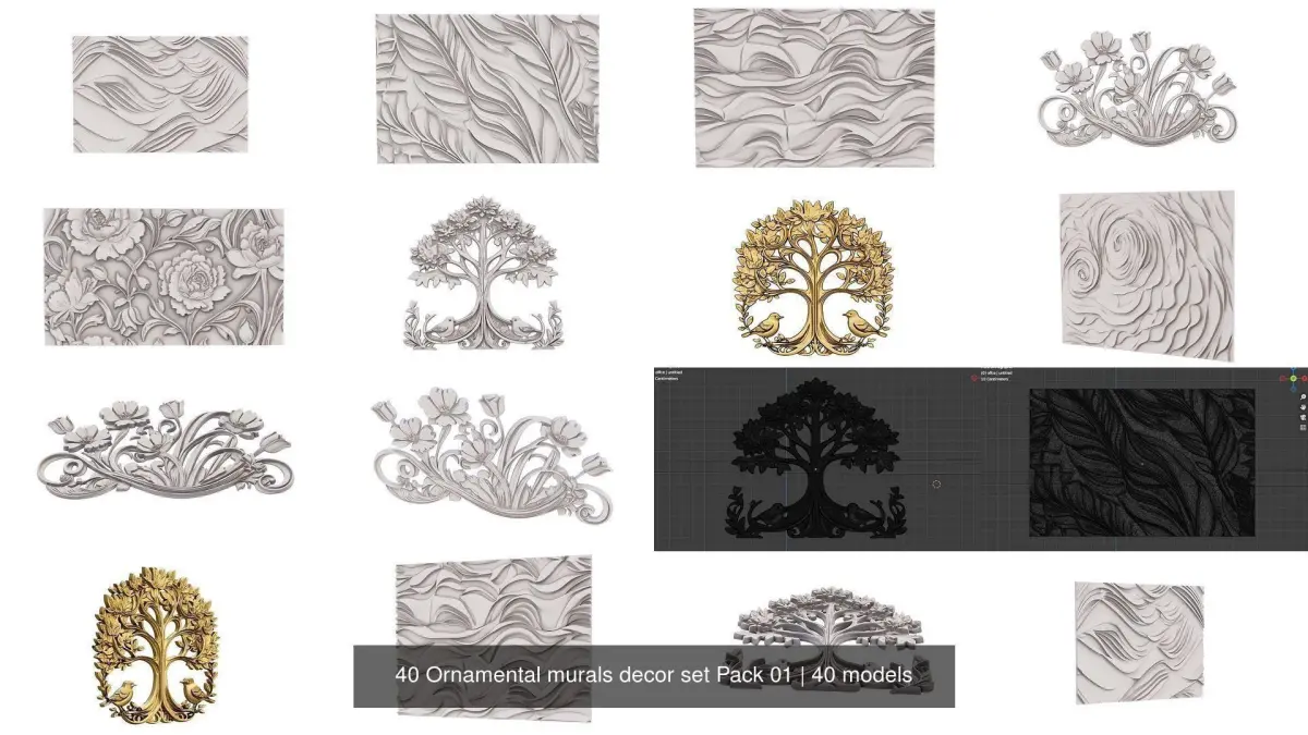40 items Ornamental murals decor set Pack 01 In case of need please use subdivision modificators for more smooth results Model is ready for visualization, CNC production and 3D printing format files: ,blender 3.0,fbx,obj,stl for cnc or 3d printing NC/3D print ready For 3D printing Please rate and write the review of our model