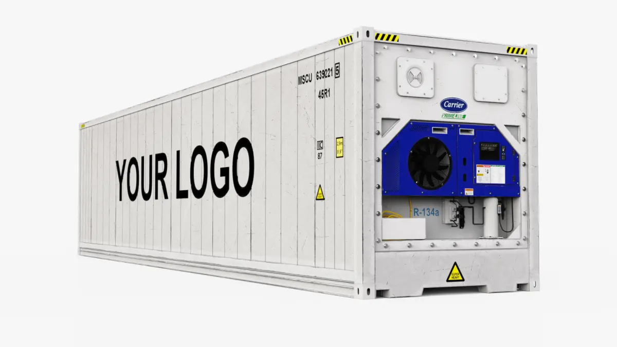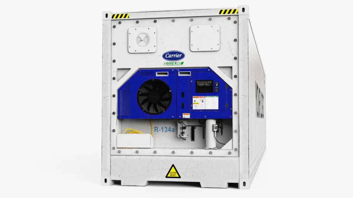 A refrigerated container is a shipping container that remains its cargo at a regulated, cool temperature. A reefer usually works at a temperature range of -30°C and +30°C and handles frozen, chilled, or cold goods. High quality shipping container model equipped with reefer CARRIER. Refrigerated by Carrier. Container type- 40 feet High Cube. Modeled in Maya 2023. Real-world scale. All textures with 4096x4096. Maps- Diffuse, Glossiness, ior, Normal map, Refection, Opacity.Extra PBR maps- Occlusion, Metallic, Roughness. .PSD BaseColor editable to use your logo.