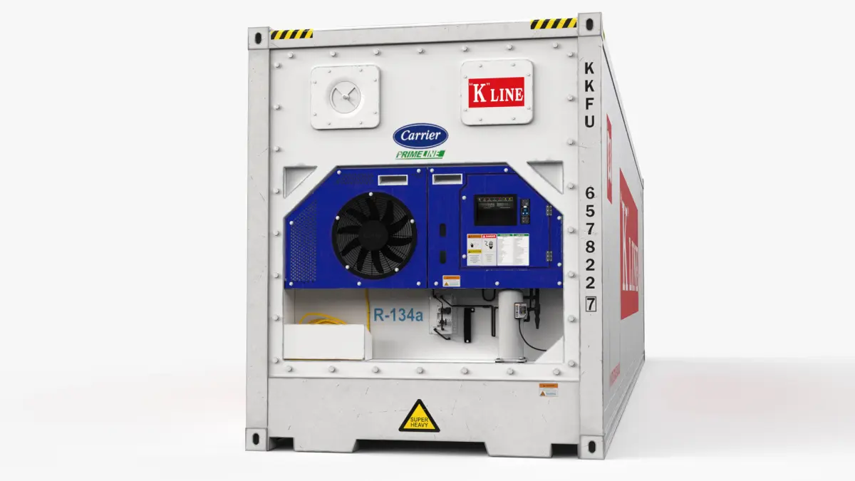 High quality shipping container model equipped with reefer CARRIER. Shipping Company- K-LINE. Refrigerated by Carrier Container type- 40 feet High Cube. Modeled in Maya 2023. Real-world scale. All textures with 4096x4096. Maps- Diffuse, Glossiness, ior, Normal map, Refection, Opacity. Extra PBR maps- Occlusion, Metallic, Roughness.